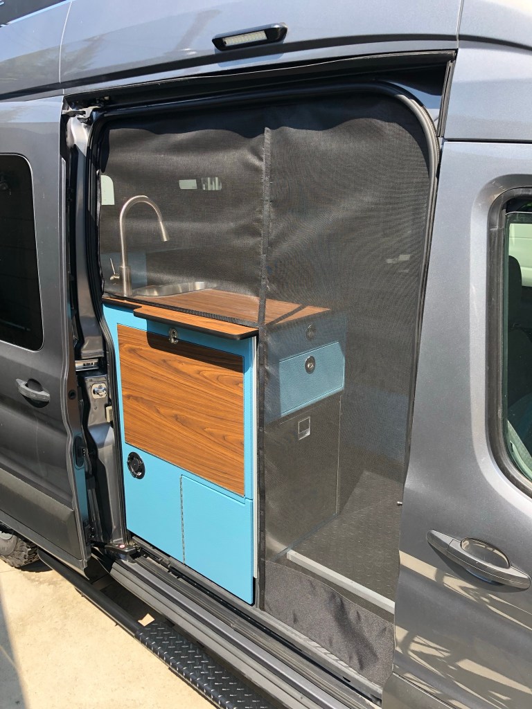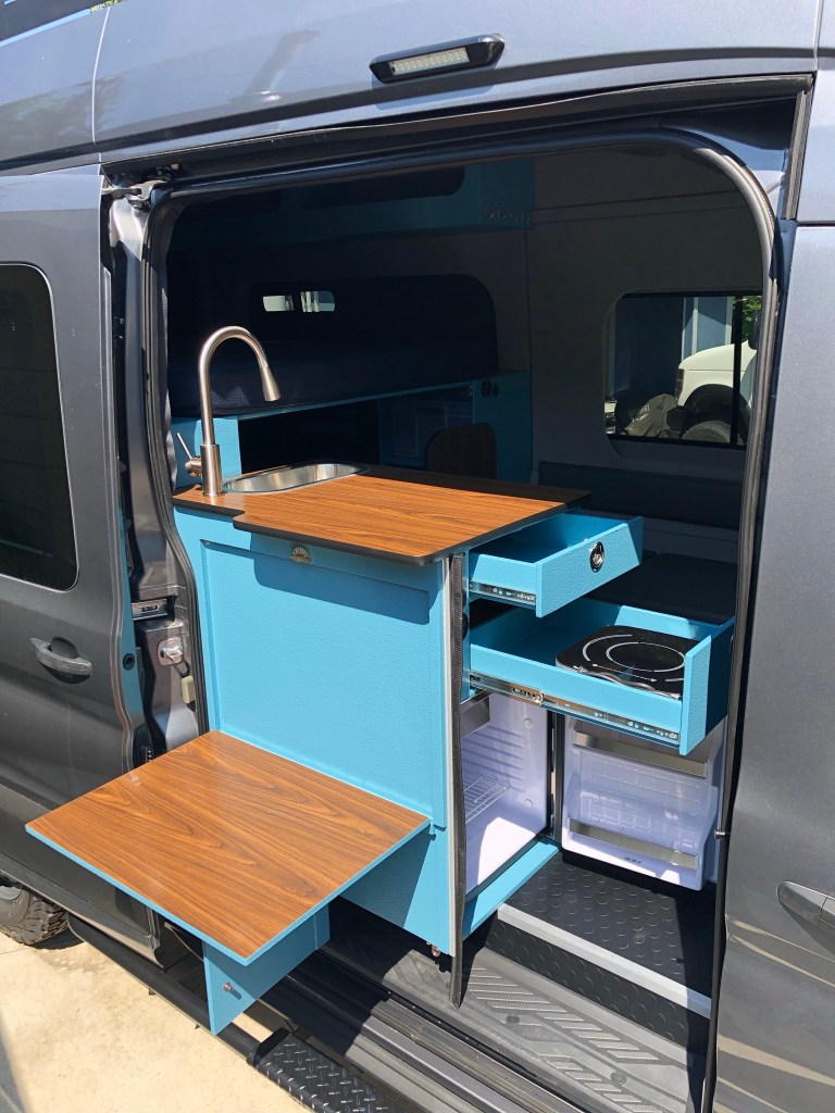 Pinnacle Campers kitchen cabinet with exterior drop down table, 2 full extension self-close drawers, slam latches, vents, walnut countertop, stainless backsplash, setup for Isotherm Cruise65