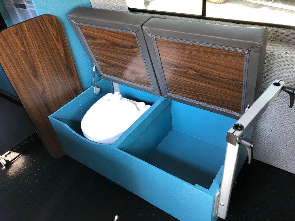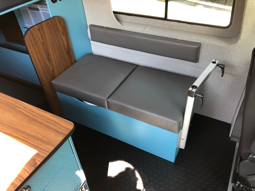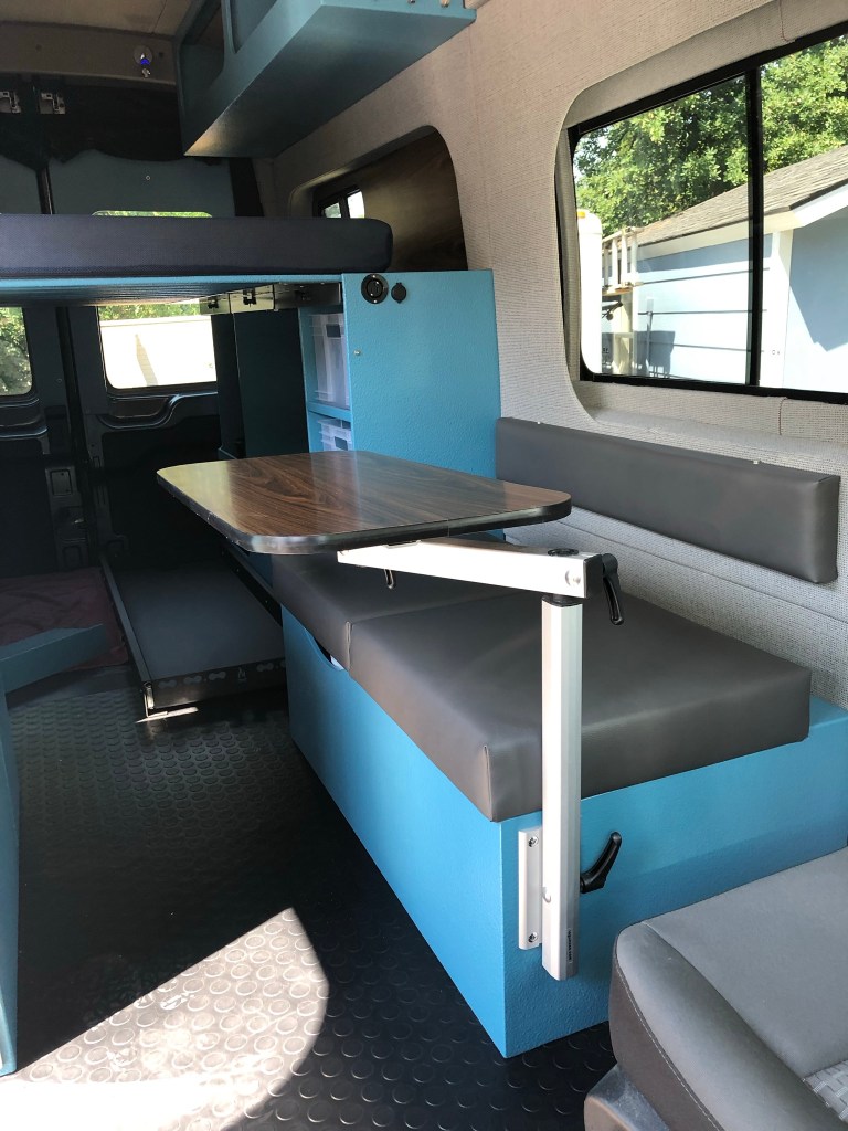 Set up with an indoor/outdoor kitchen and dinette seating for two at the swivel seats or at the driver’s side bench seat utilizing a swiveling table mount and walnut laminated table top.