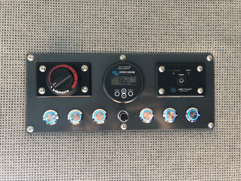 Lithium battery package with 30amp vehicle charging and 200 watts of solar powers a 12volt stainless steel fridge, remote controlled vent fan, and front, rear zoned and dimmable lighting.