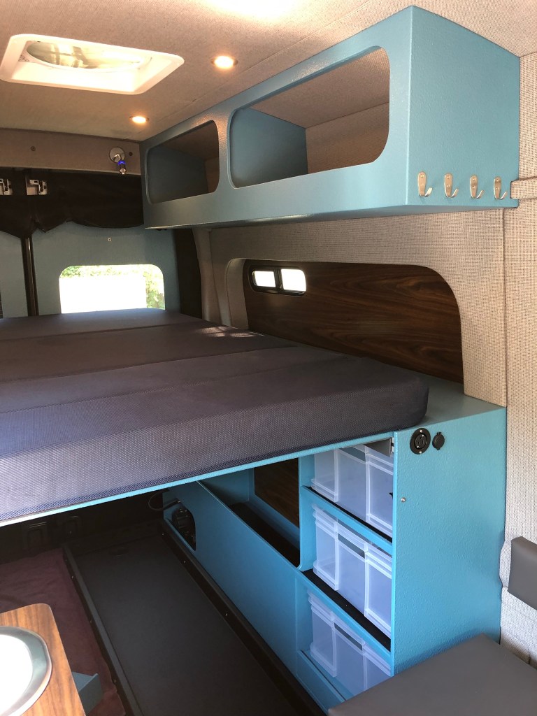 Pinnacle Campers bed kit set up for N-S sleeping, Full 52×78. Wheel well storage cubbies, powerwall/integrated batteries, removable bins, removable platform slat panels