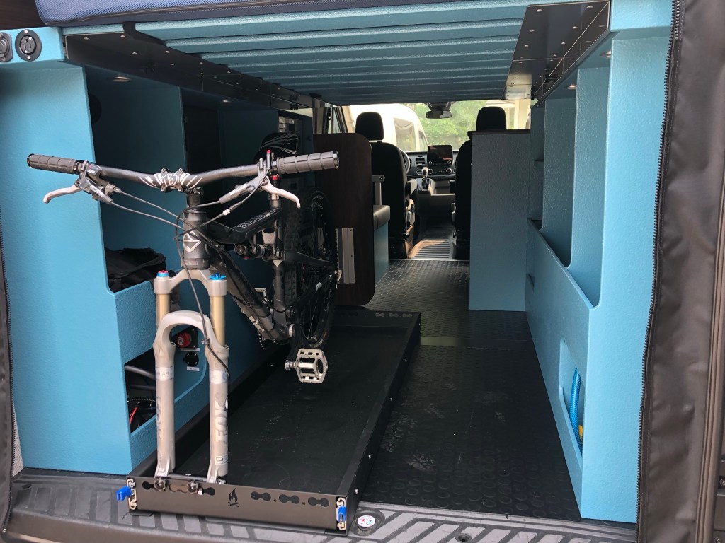 Loft bed with 41” clearance for bikes mounted on the full extension drawer slide. Tons of storage in the cubbies and built in bins under the bed, inside the bench seat and the overhead shelf.