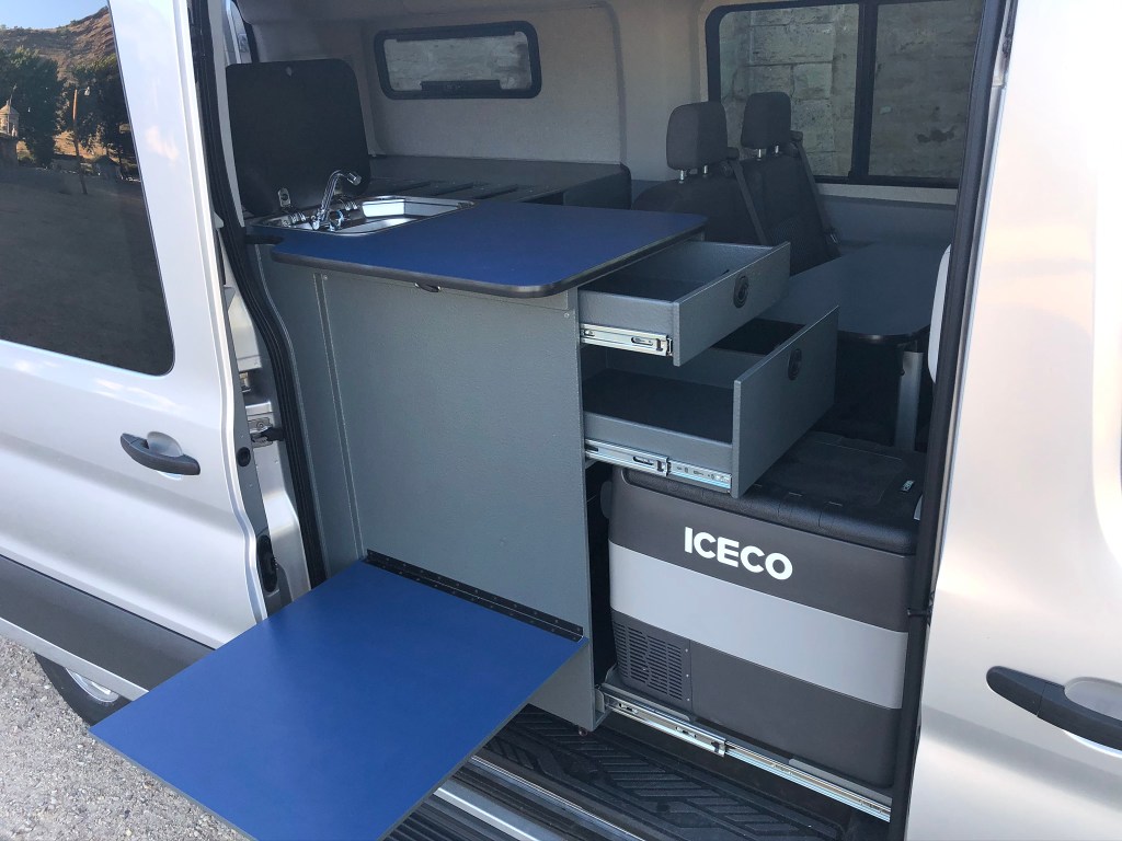Indoor/outdoor kitchen with 12v fridge on a drawer slide. Two huge drawers, lower cabinet and a glass top sink with faucet.