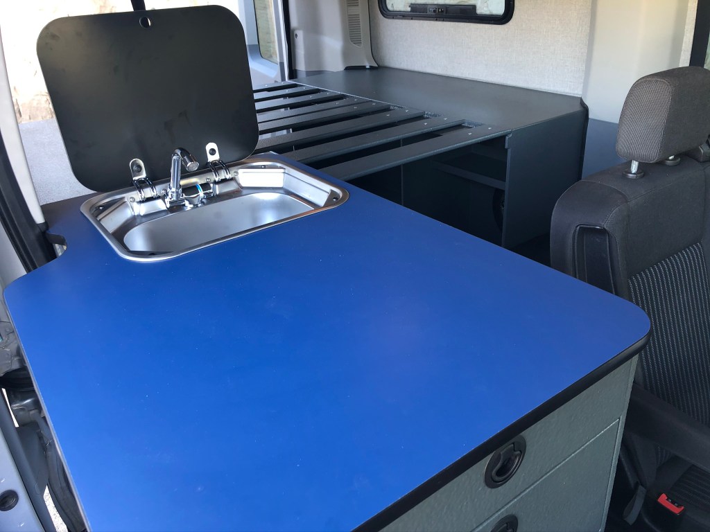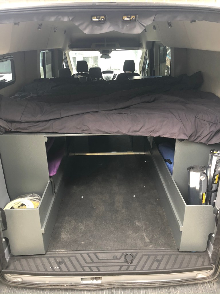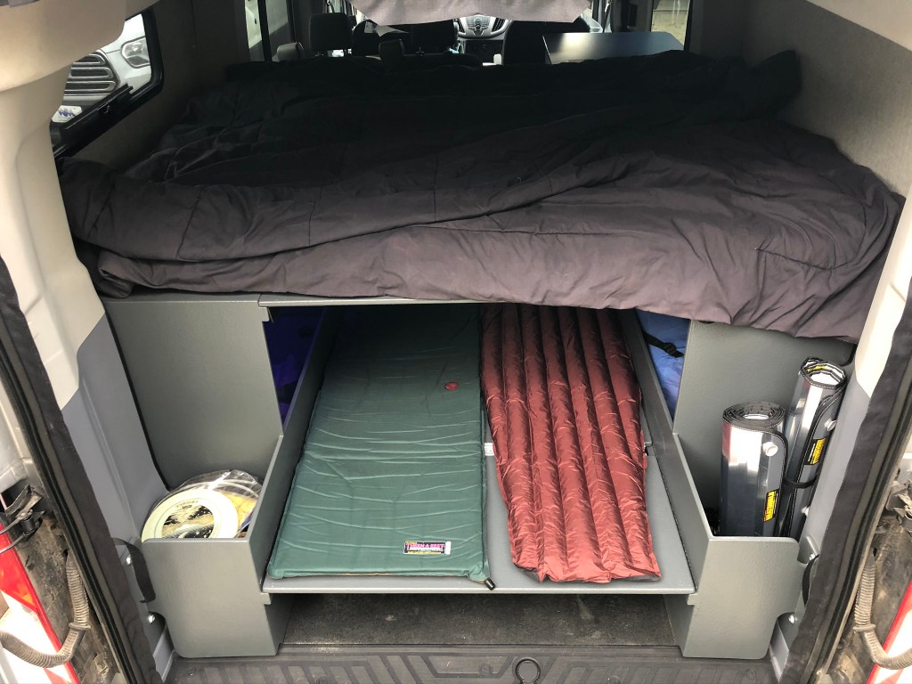 Pinnacle Campers conversion! This time with Flarespace flares which allow “east/west” sleeping on the upper bunk and N/S sleeping for kids (or dogs?) on the lower bunk. Each bed platform is removable.