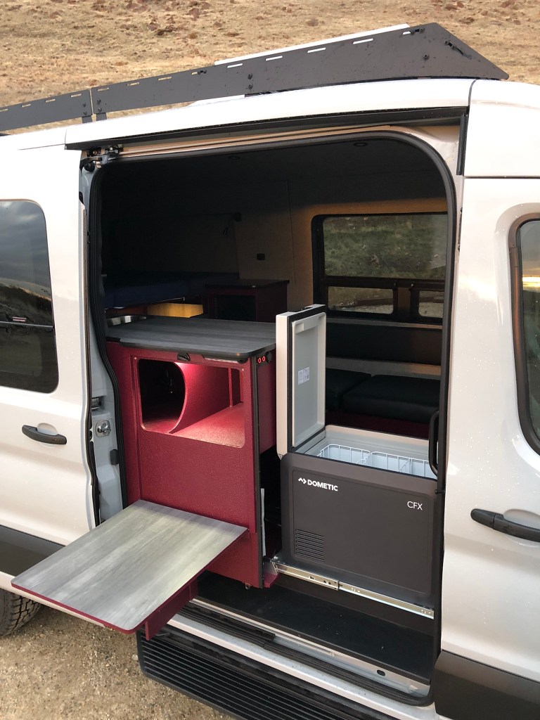 Lithium battery package with heating circuit. 30amp vehicle charging, and 200 watts of solar powers the 12volt Dometic CFX3 45L fridge, remote controlled vent fan, front, rear zoned/dimmable lighting, and outlets.
