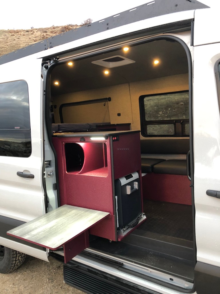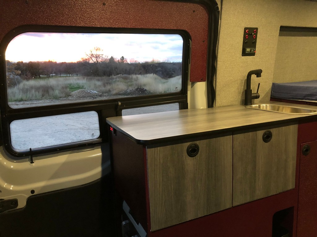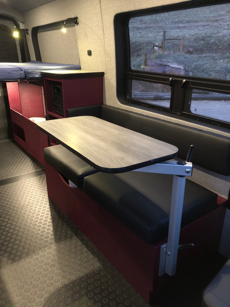 This van is set up with the requisite indoor/outdoor kitchen featuring a pull out drawer fridge, exterior drop down table and “pass through” accessible storage. There is dinette seating for two at the swivel seats or at the driver’s side bench seat utilizing a swiveling table mount and grey wood grain laminated table top. Loft bed with 37” clearance for bikes mounted on the full extension drawer slide. Tons of storage in the cubbies and built in crate/bin cabinet, inside the bench seat, and kitchen under sink cabinet.