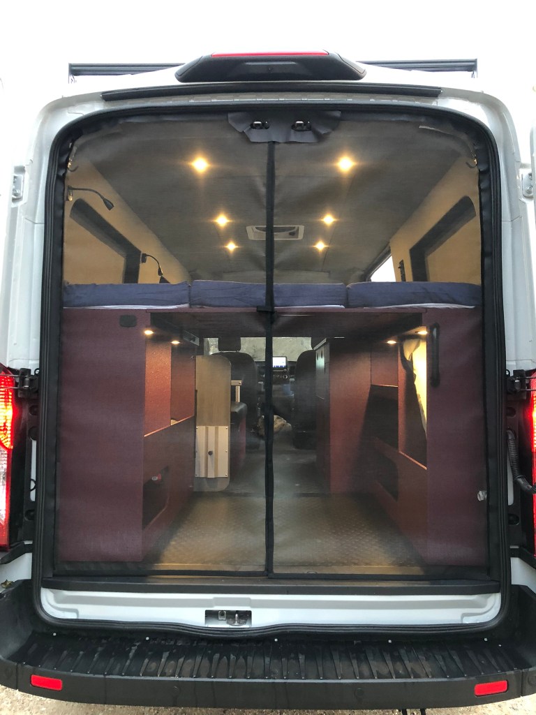 Nightfall Overland shades for windshield and cab doors, driver and passenger side forward window. Custom zippered shades for rear door windows.