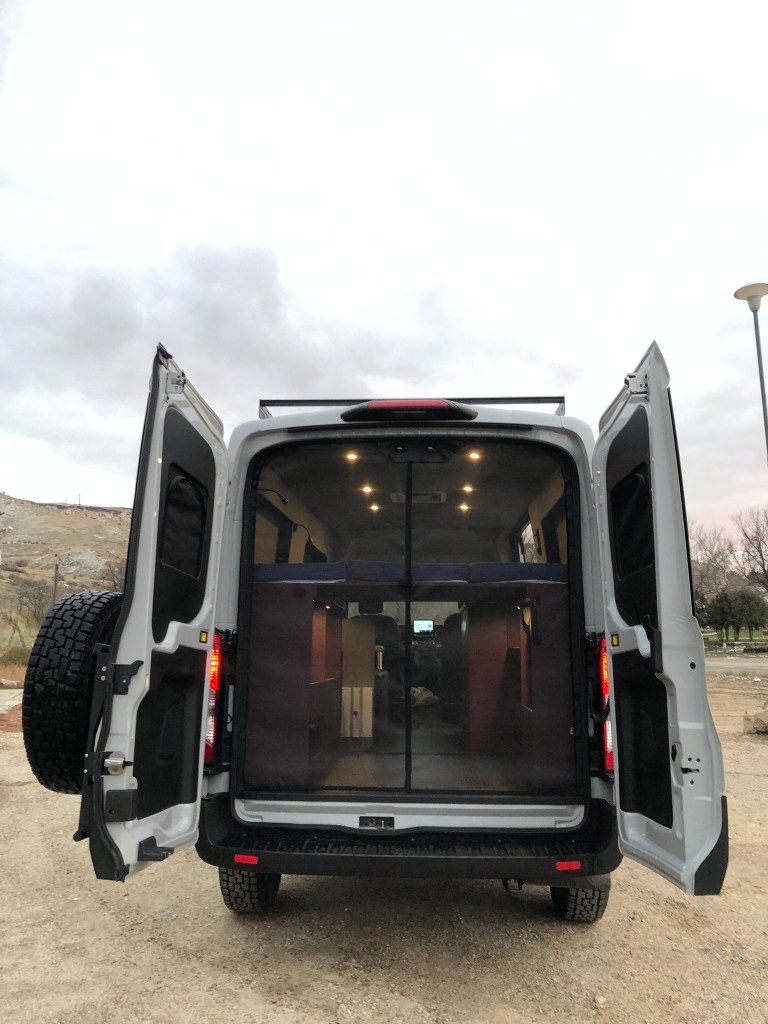 Exterior goodies include a 2″ lift kit, larger tires, rack, ladder/spare tire rack, and opening windows in the rear doors, and the driver an passenger side forward locations.
