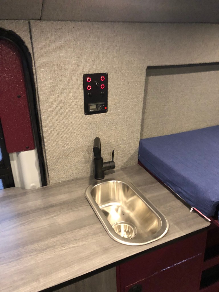 Water storage includes an under floor mounted 16 gallon fresh water tank which supplies the faucet with pullout sprayer, sink, and rear outdoor shower port with hand held shower head.