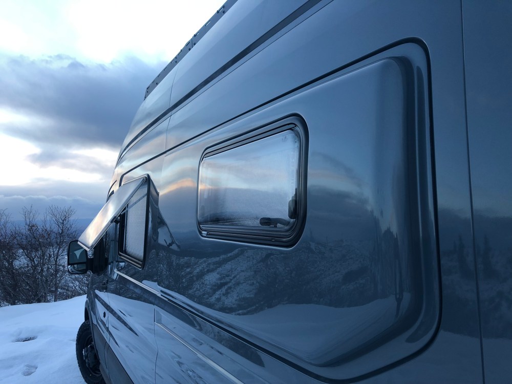 Arctic Tern window package, dual pane acrylic awning windows with integral blind/screen. Driver side forward, and flare, slider door and rear doors