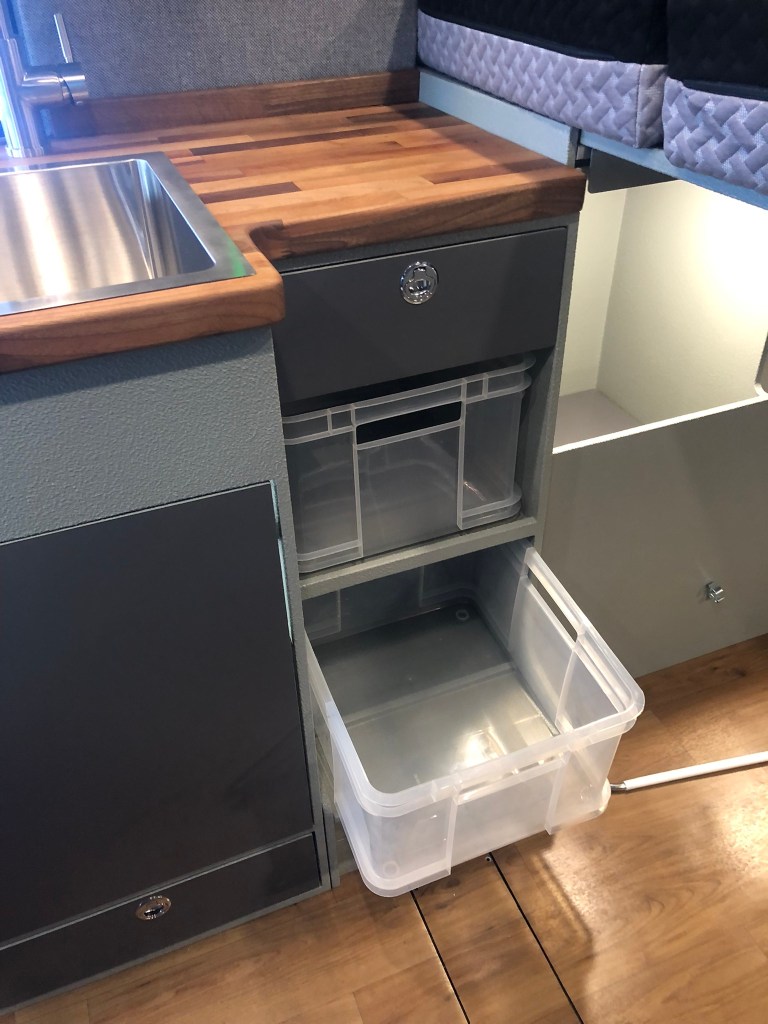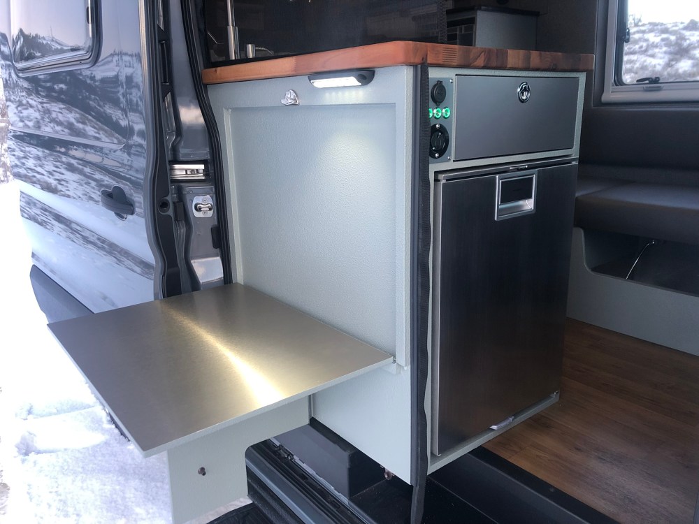 Pinnacle Campers indoor/outdoor kitchen cabinet with exterior drop down stainless steel table, 2 full extension self-close drawers, slam latches, vents, walnut butcher block countertop, stainless sink/faucet, and sprayer, setup for Dometic CRX80 stainless fridge. Crate tower with 2 crates and drawer.