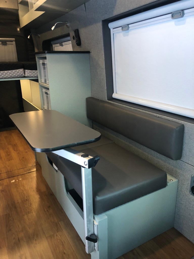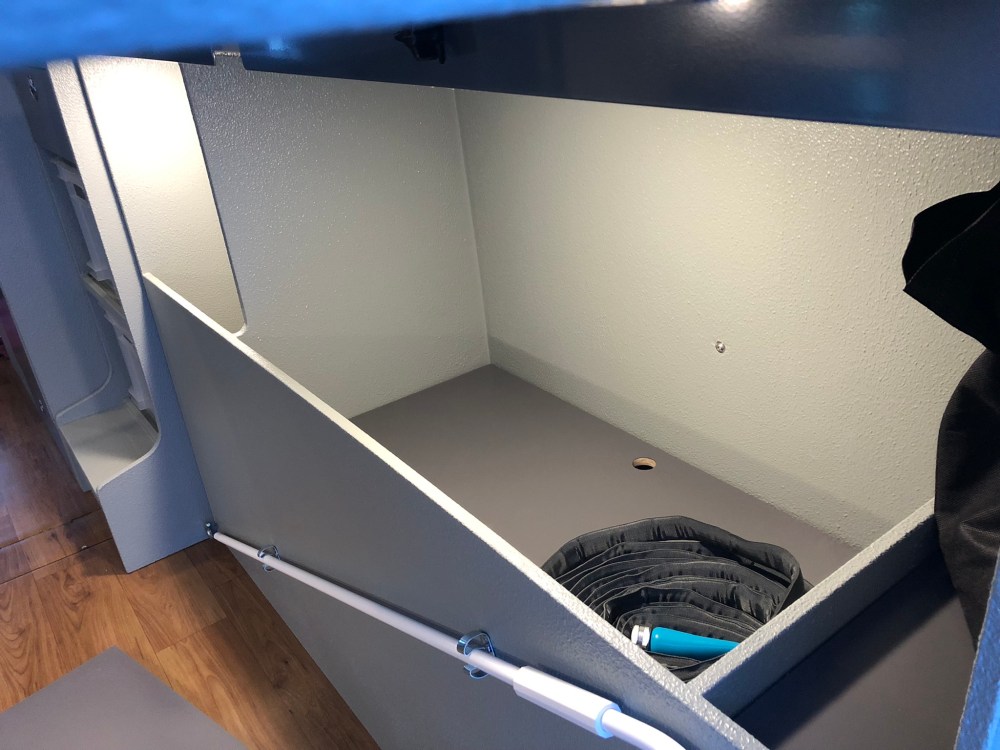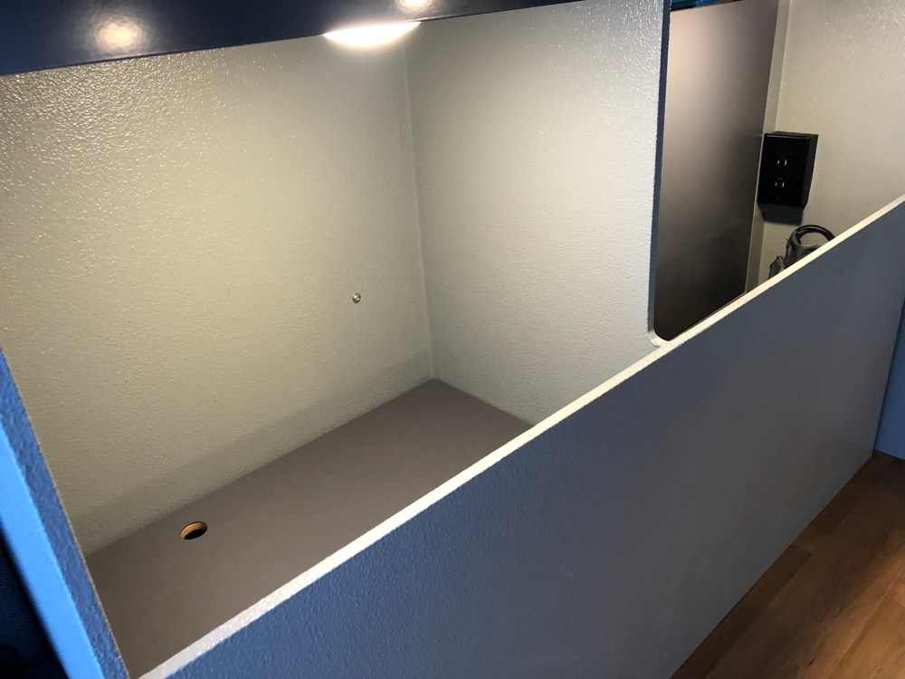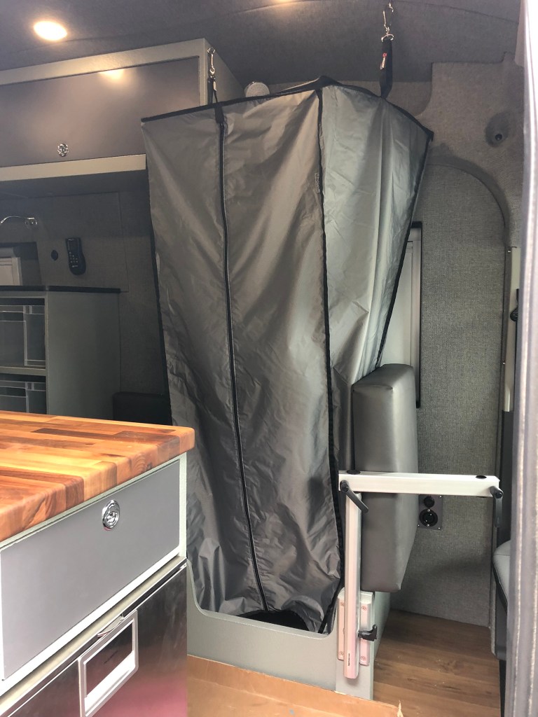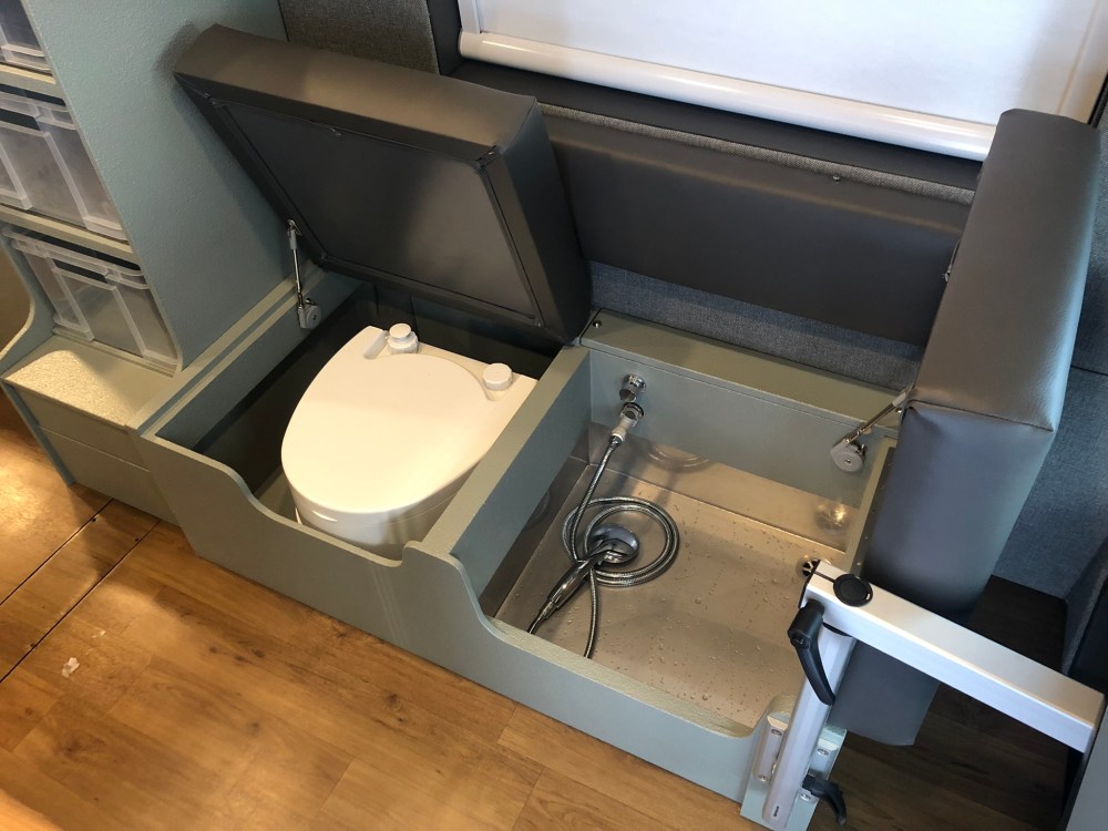 Bench Box 46″, 4″ foam vinyl upholstered backrest and cushion split at 50/50, storage under, porta-potty locator inside left, stainless shower pan with deployable shower curtain, handheld shower and mixing valve on right. Thats right its a full bathroom in a bench seat!