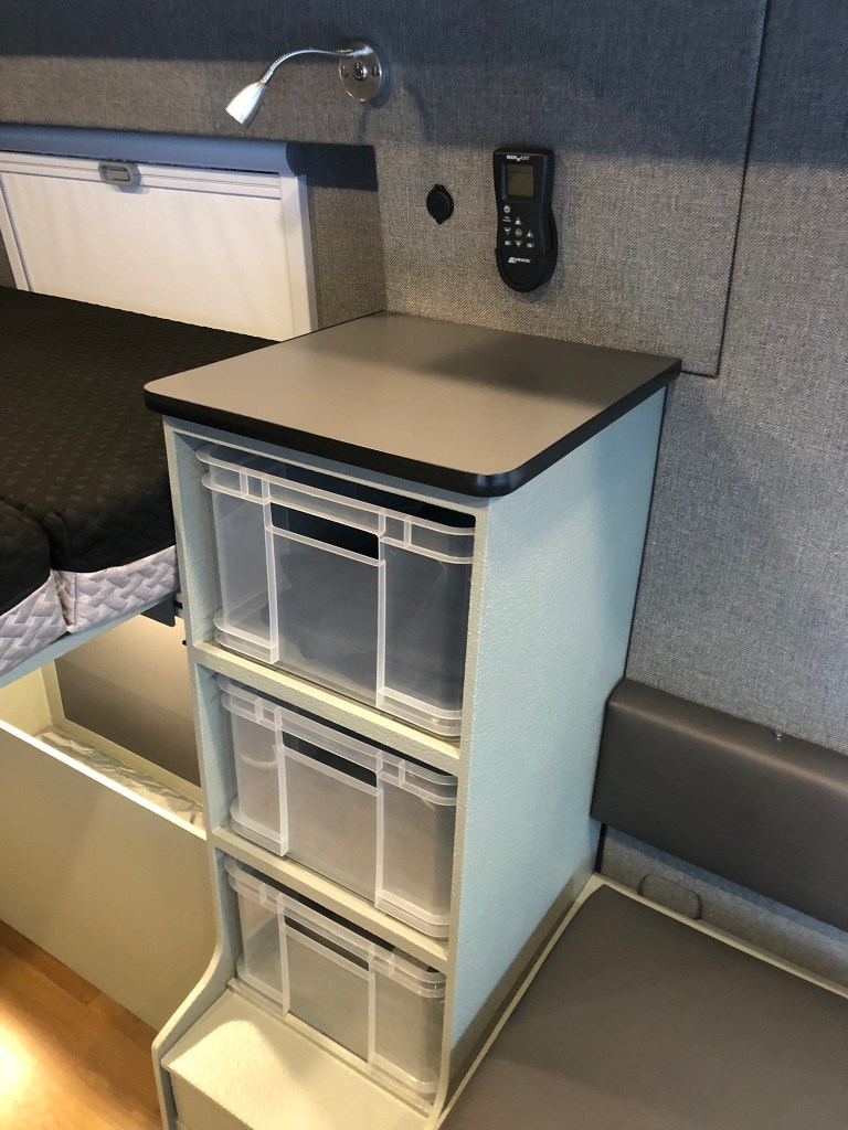 Pinnacle Campers bed kit set up for east/west sleeping, Full 52×78, 6″ memory foam mattress. Wheel well storage cubbies, powerwall/integrated batteries, removable platform slat panels set at 37″ height