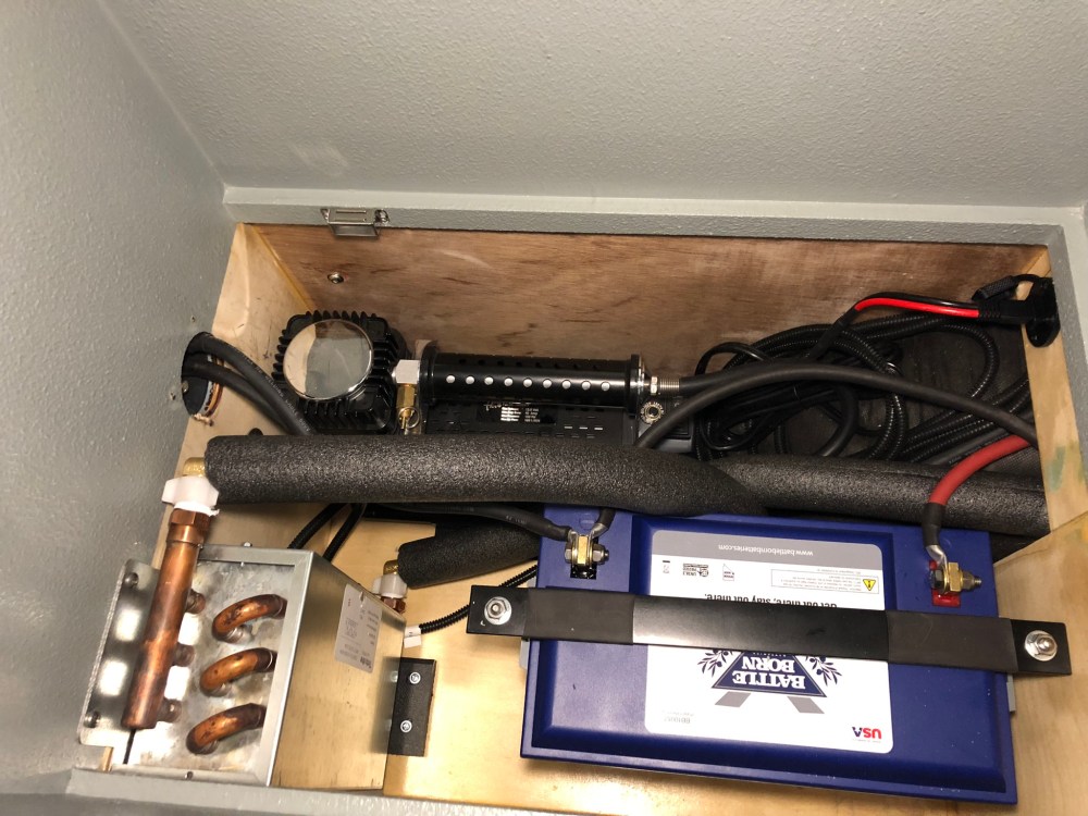 Grey tank 10 gallon under mount (DS) with aluminum skid plate, manual dump valve, vent/over flow, heated via Elwell coolant loop
