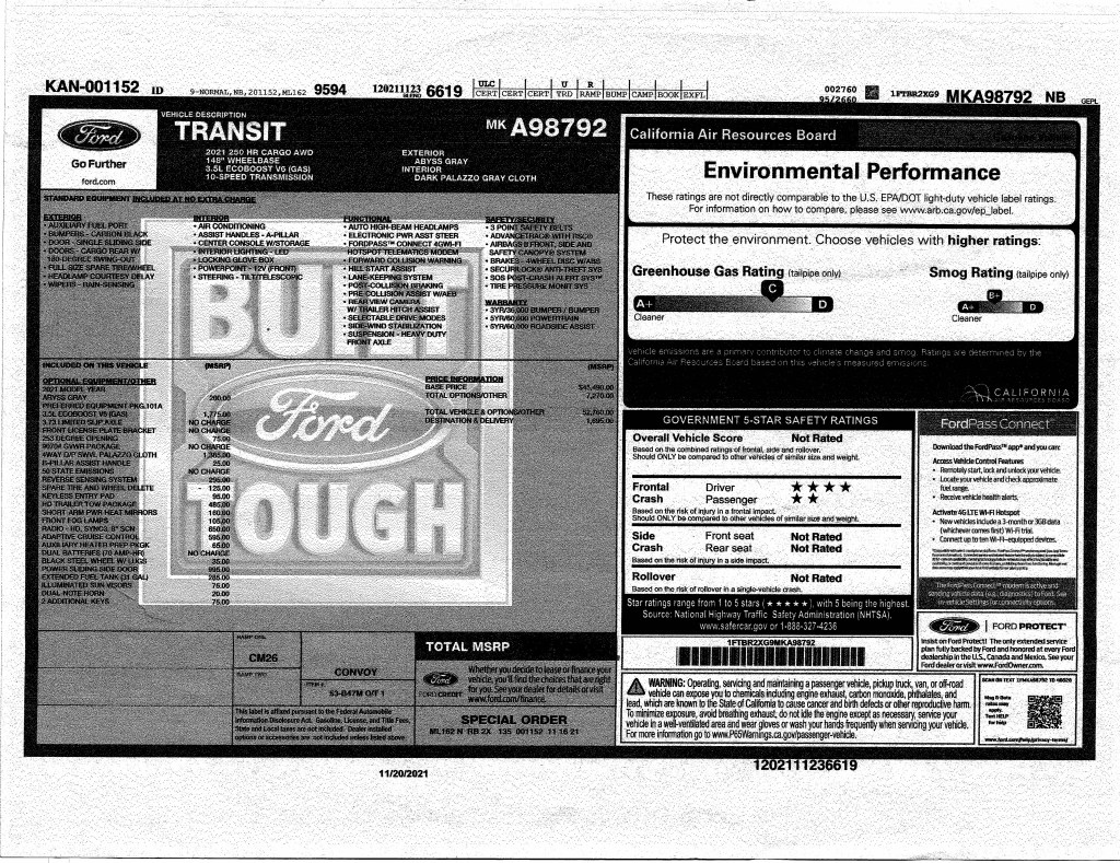 2021 Ford Transit 250 AWD, 148″WB regular length, Abyss gray, ecoboost v6, swivel seats, power sliding side door, tow hitch, extended range tank, see window sticker for all options.