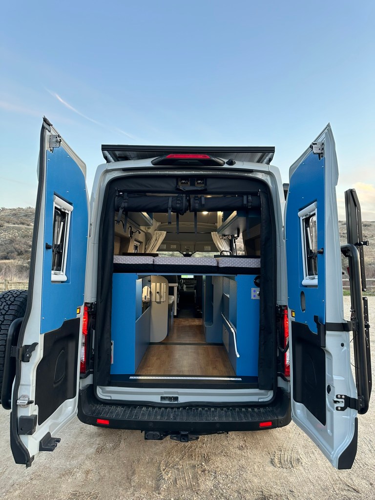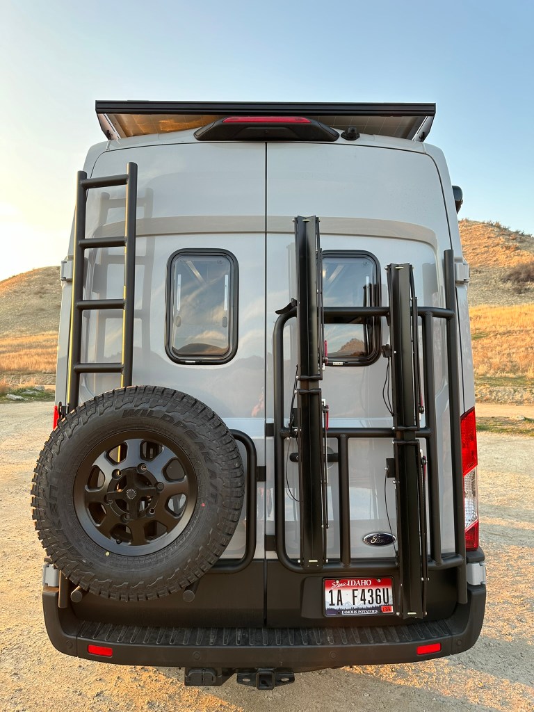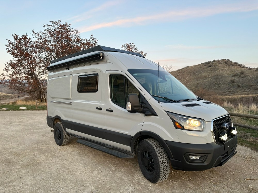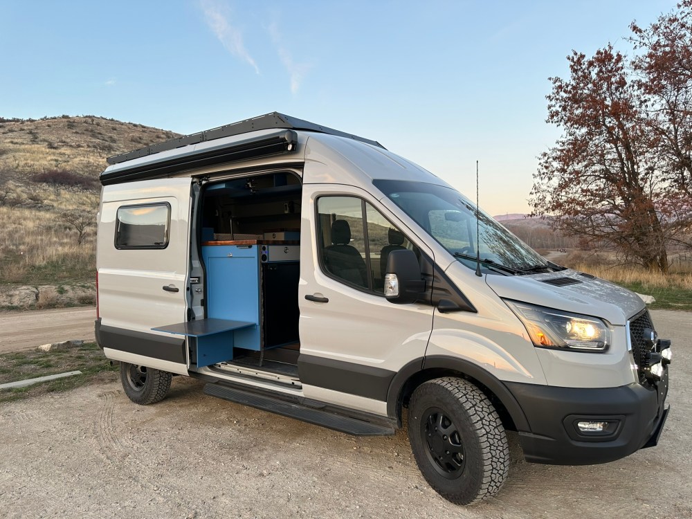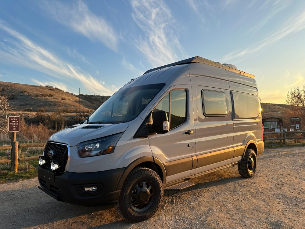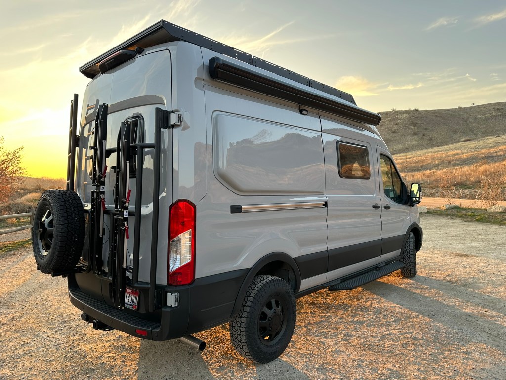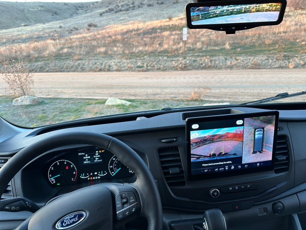 Based on a new 2023 Ford Transit 250 AWD, 148″WB regular length, Avalanche gray, featuring ecoboost v6, swivel seats, tow hitch, extended range fuel tank, 12″ screen, adaptive cruise, virtual rearview mirror, see window sticker for all options. The virtual rear view mirror is really nice given the limited vision out the back.