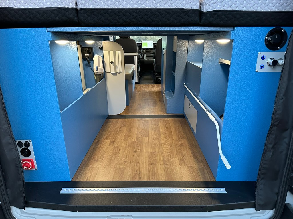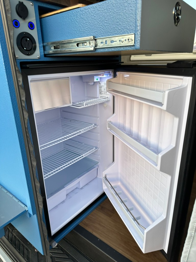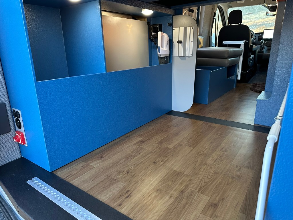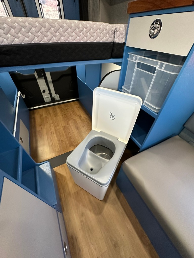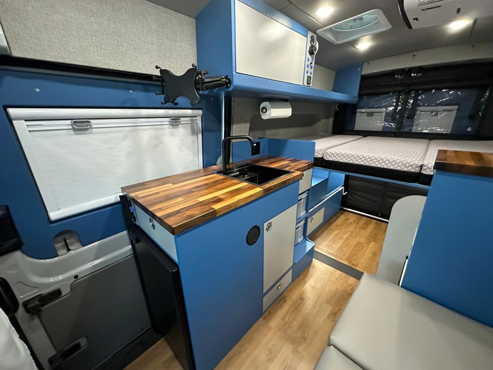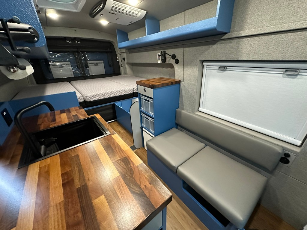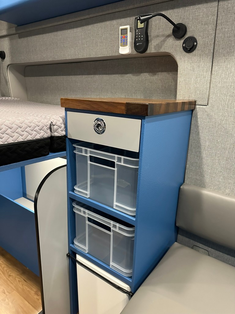 The cabinets feature a tough epoxy coating with a punch of blue and contrasted by the walnut countertops. The kitchen has the capability to be used inside or out with a massive 130L fridge and drawer stowed induction cooktop. The black stainless sink has a fold down faucet and bamboo cutting board drop in to increase counterspace. There are many storage and organization options including the bins and drawers in the crate towers, bench seats, overhead cabinets and under bed cubbys.