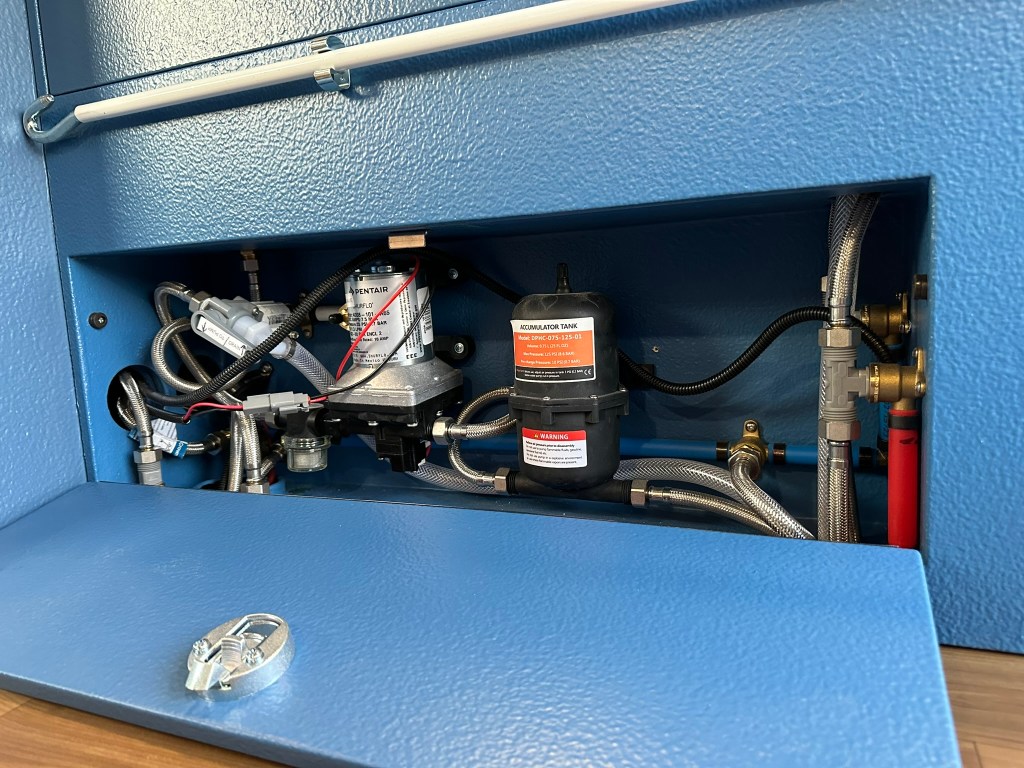 Water system: 21g fresh inside, 4 gallon hot water, 12g grey under