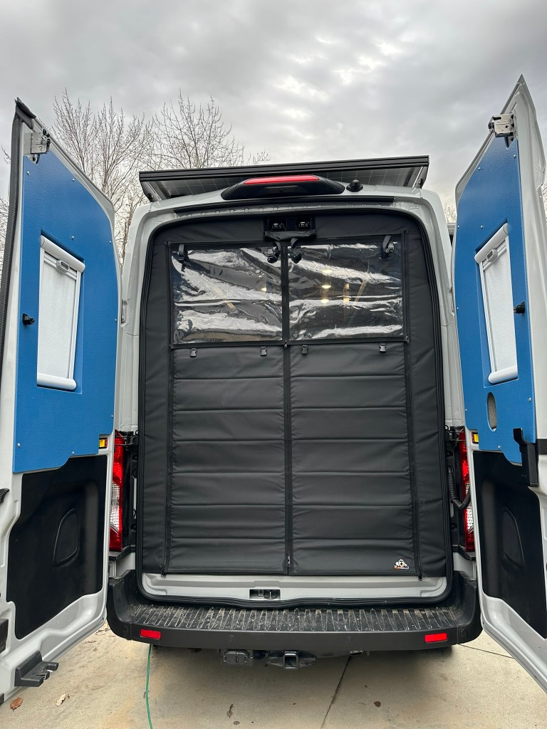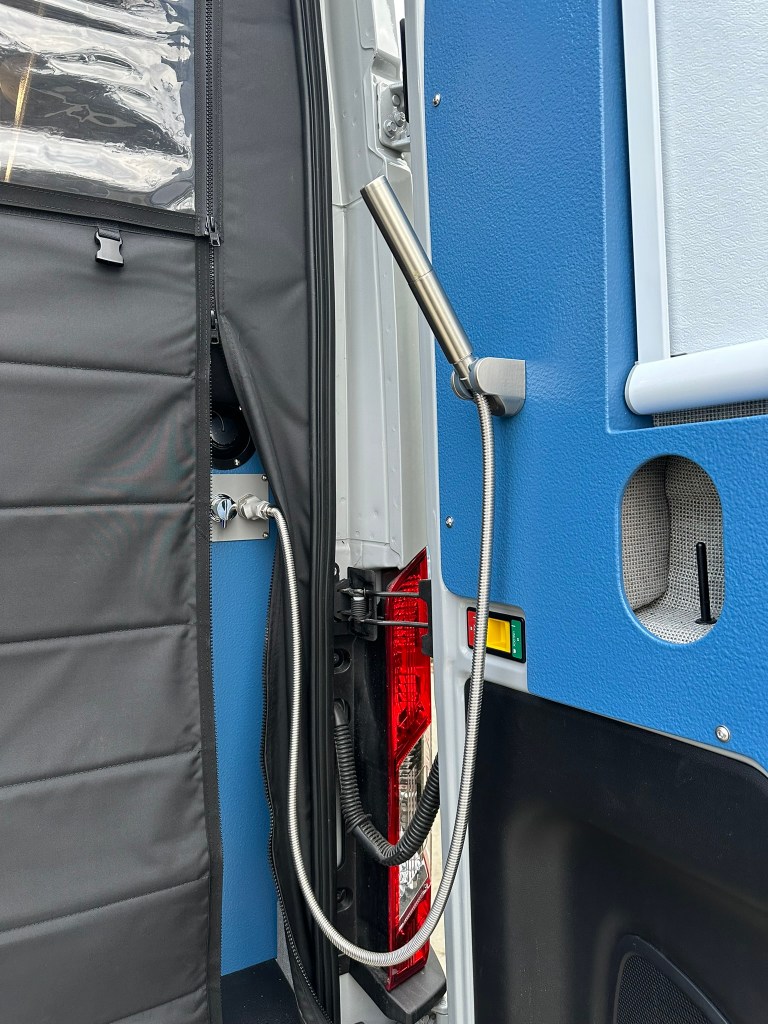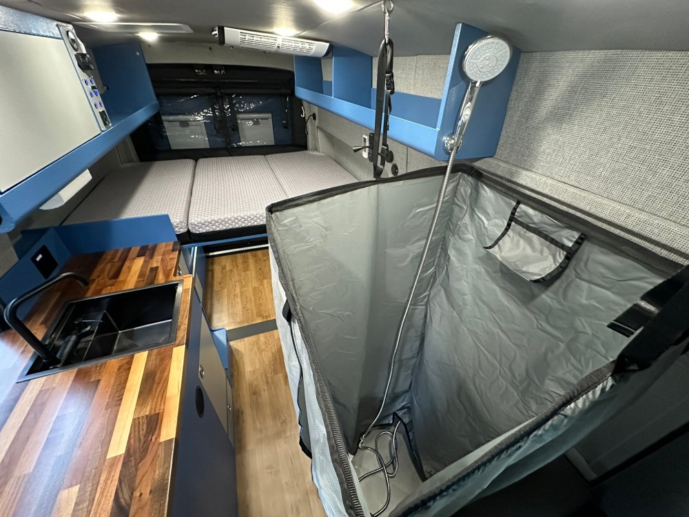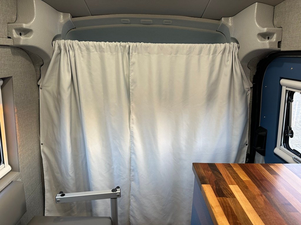 Cab divider curtain kit can be deployed between the open rear doors for shower privacy.
