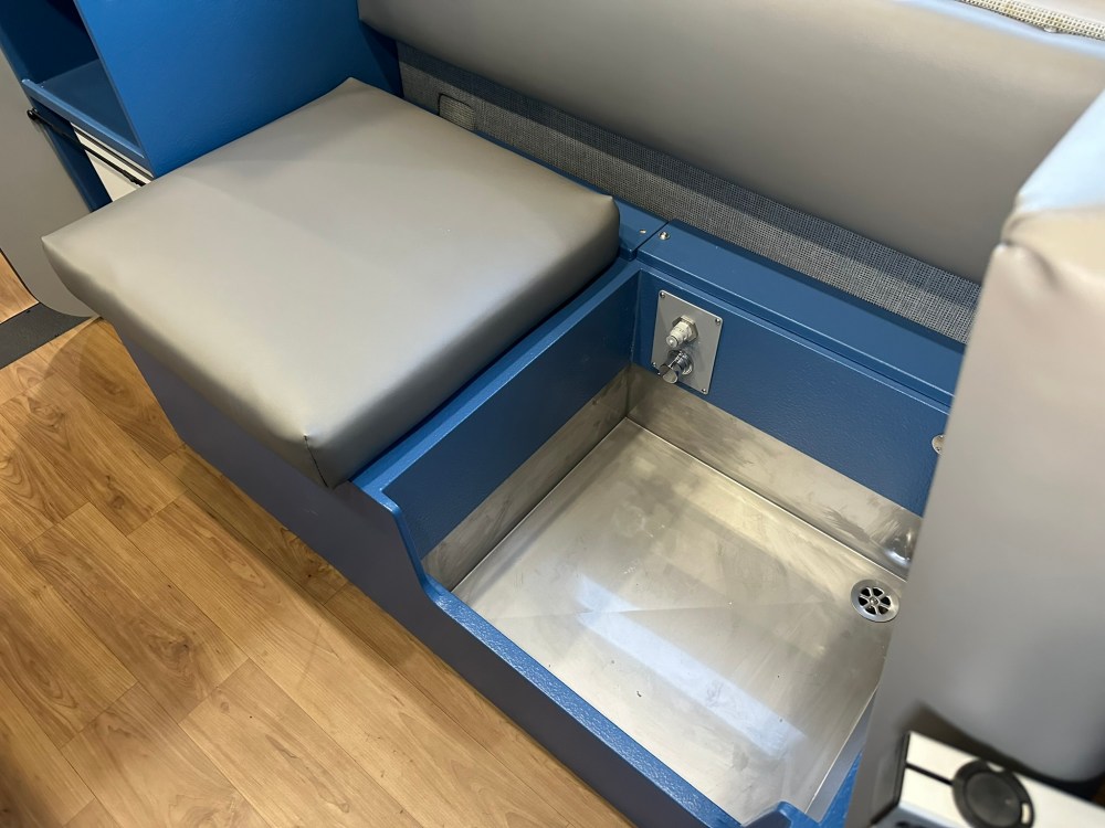 Bench seat has 4″ foam vinyl upholstered cushions split at 50/50, storage under, stainless shower pan with deployable shower curtain, handheld shower and mixing valve. That’s right, there is a full shower in the bench seat!