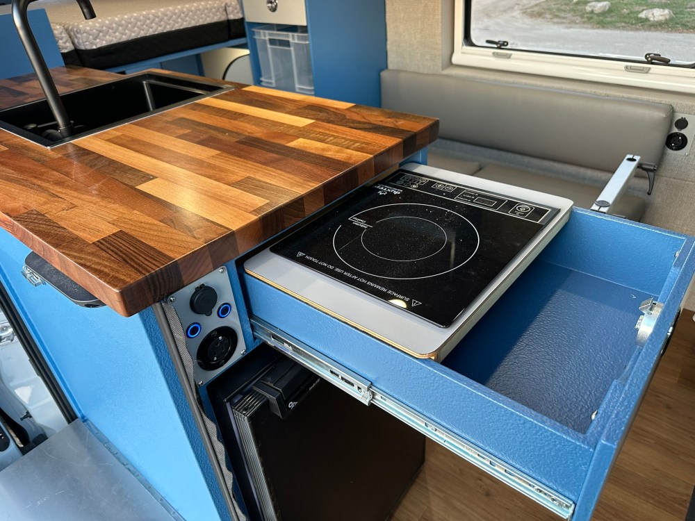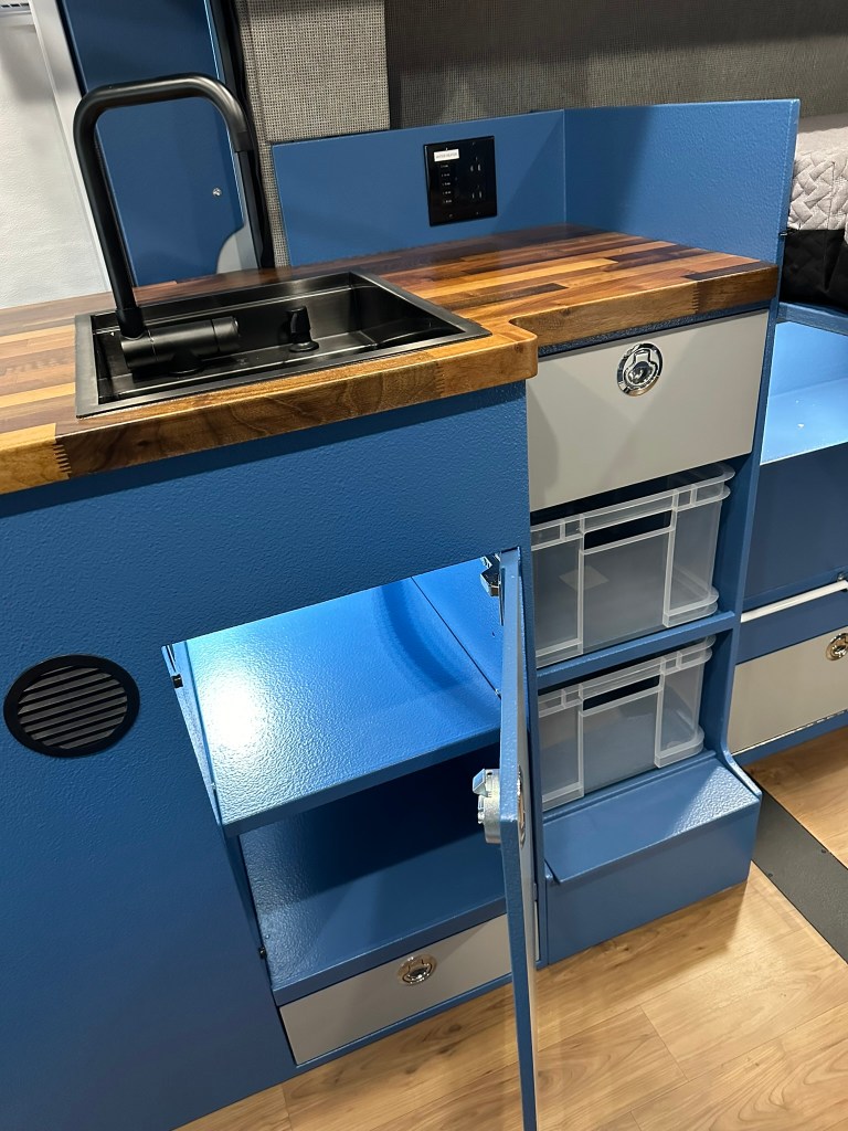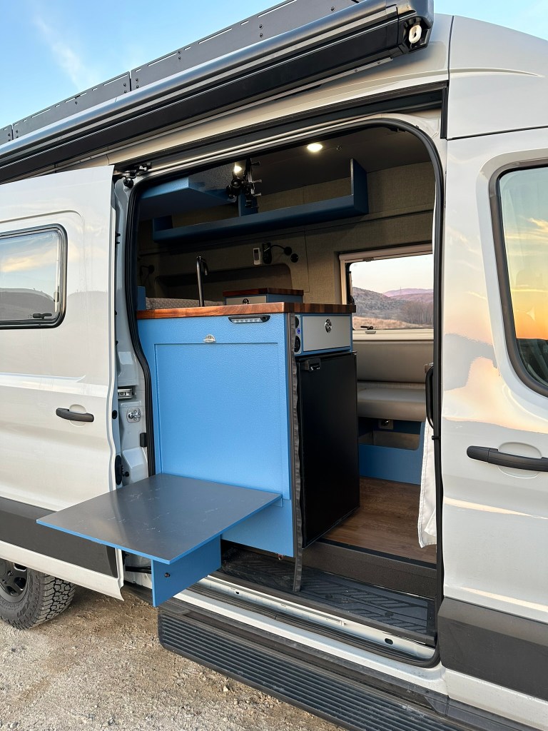 Pinnacle Campers indoor/outdoor kitchen cabinet with exterior drop down stainless steel table, 2 full extension self-close drawers, slam latches, vents, walnut butcher block countertop, black stainless sink/drop down faucet. This kitchen is setup with 130L Indelb 12v fridge. The interior also features two crate towers with 2 crates and two drawers each. The drivers side crate tower/nightstand also stows the Trelino Evo L separating toilet. We love these crates, they make it so easy to load and unload the van, take clothes into laundromats and even taking them into the grocery store to load up on supplies.