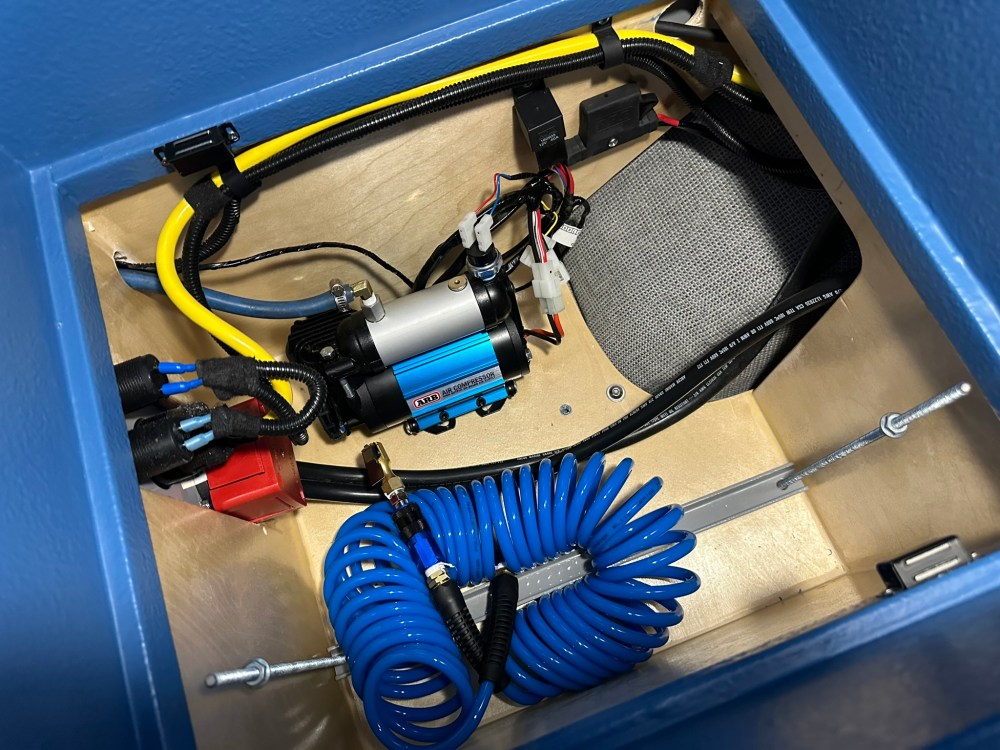 ARB Air compressor CKMA12, with rear QR fitting, locking chuck, and 25′ coiled hose. Can be used to blow out van plumbing system.