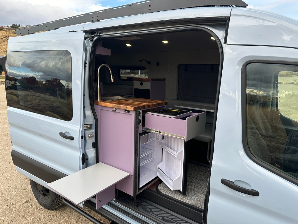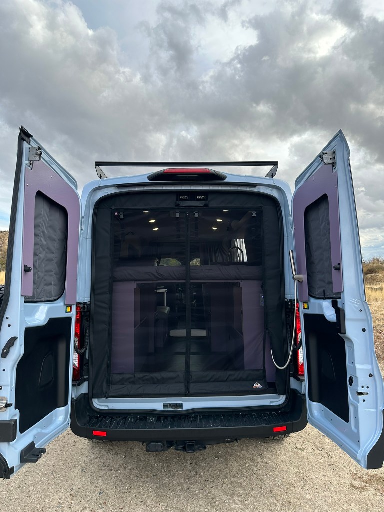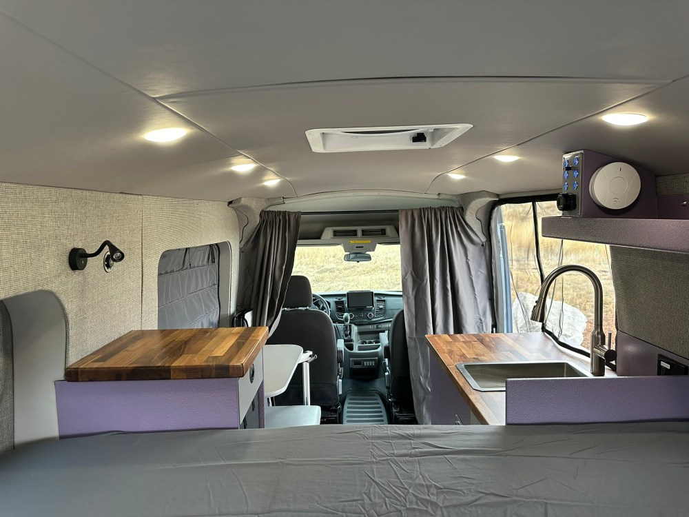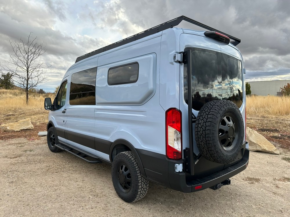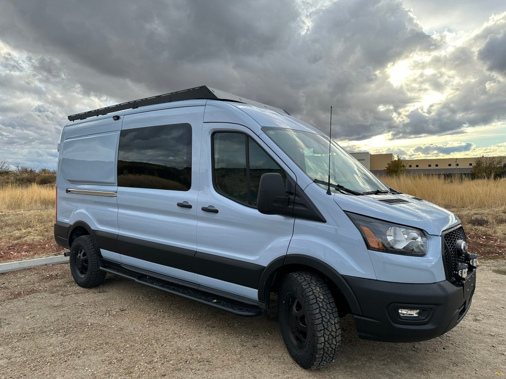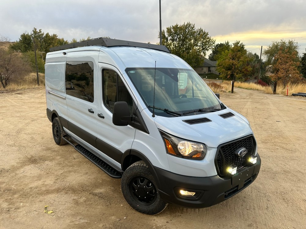 Exterior goodies include a AVC roof rack with 200watt solar panel, Van Compass Stage 1 lift kit, and VanCentric OE wheels with Falken Wildpeak mountain snowflake rated tires.