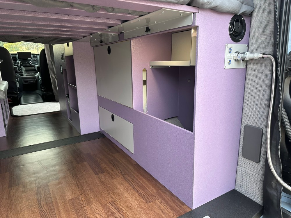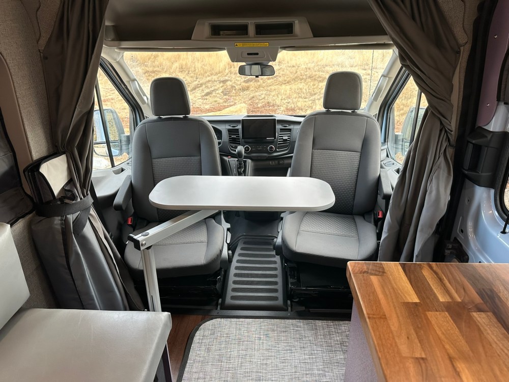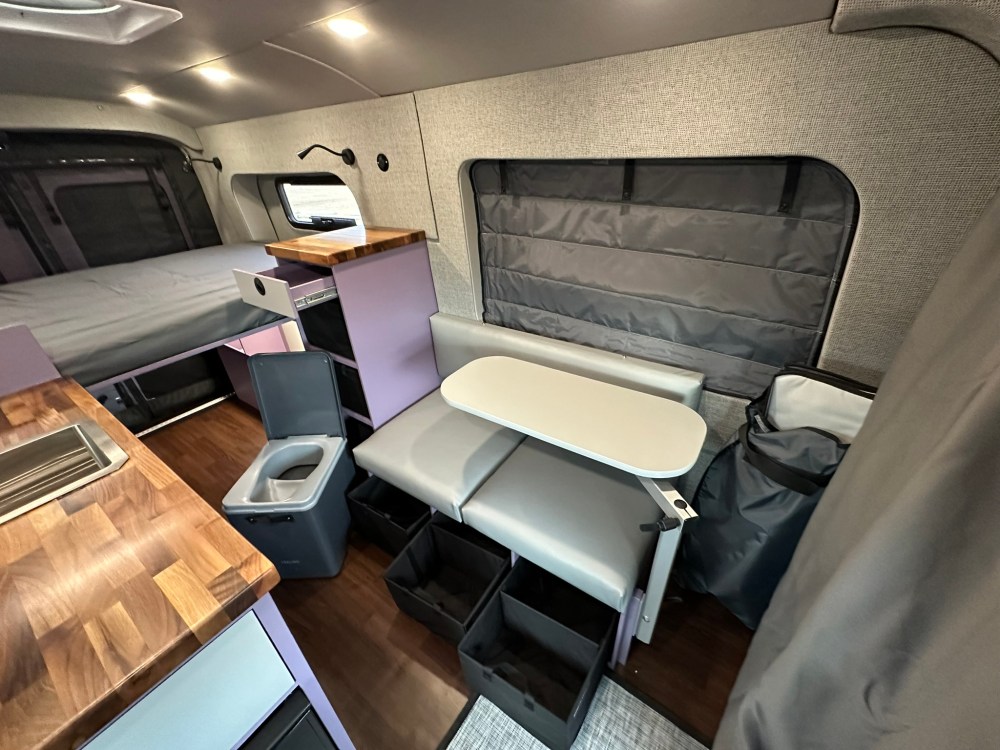 The bedside nightstand also has removable storage crates and a composting separating toilet which glides out from below. The crates are great for taking inside when loading or unloading, laundromat, grocery store, etc. whether its clothes, food, or gear, they are super convenient, take up less space and lighter than drawers. The drivers side bench seat has even more storage options below. You can set up the swiveling table at the bench seat or at the factory swivel seats via the Lagun swiveling table mount.