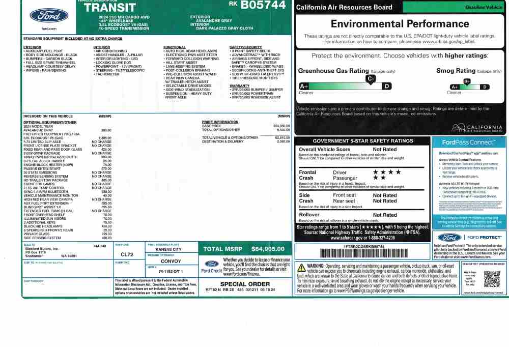 2024 Ford Transit 250 AWD- Featuring Ecoboost motor, 10 way heated power seats, passive entry/start, high res rear view camera, extended range tank, and Avalanche grey paint. See attached window sticker in slideshow for all factory options.