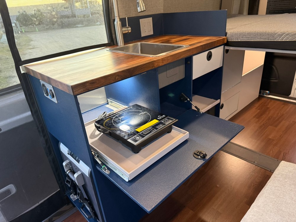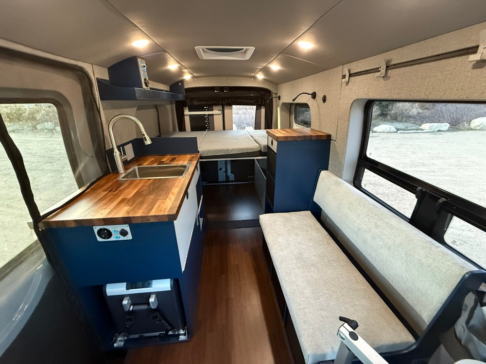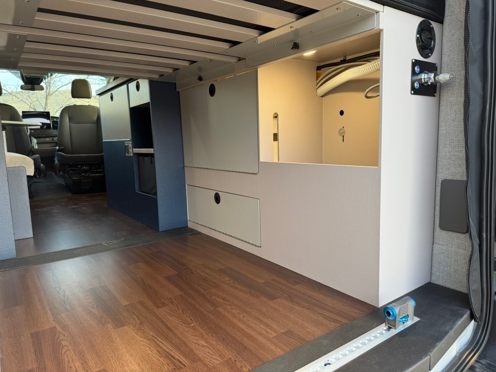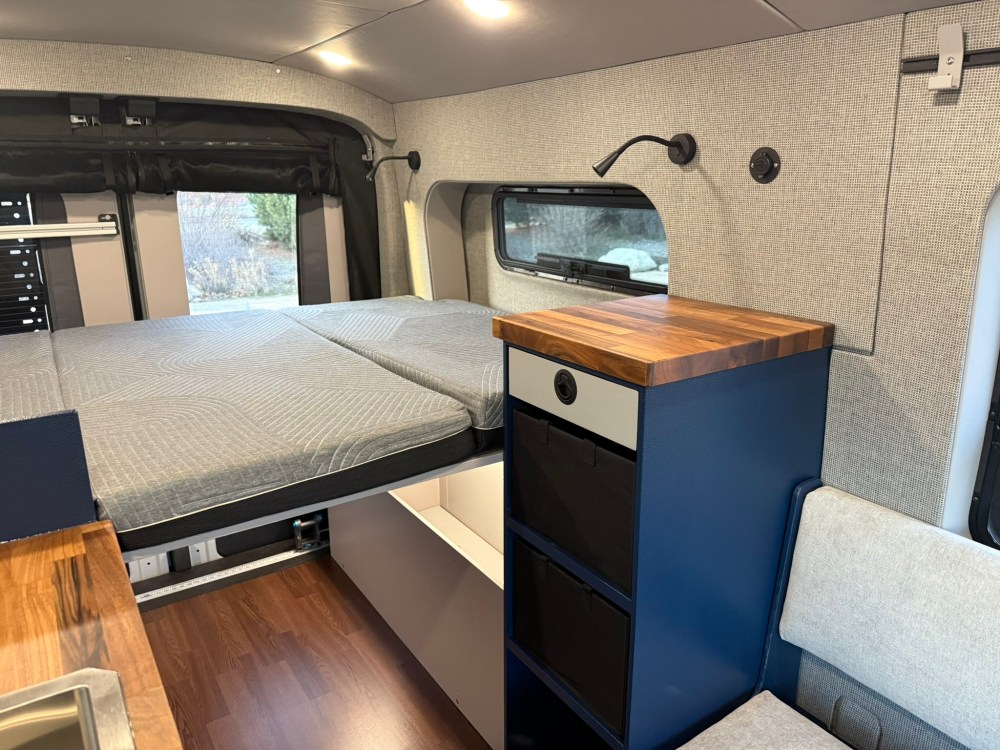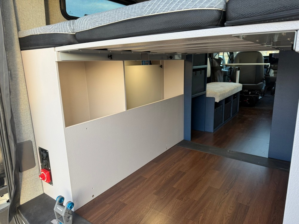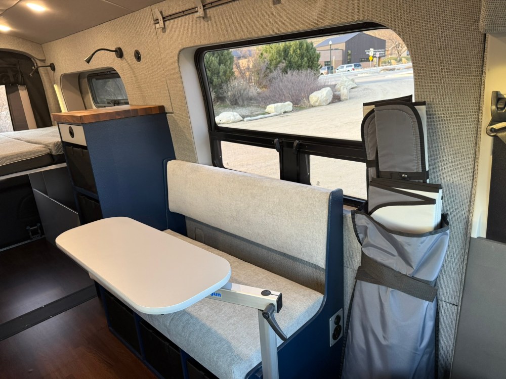 The bedside nightstand also has removable storage crates and a composting separating toilet which glides out from below. The crates are great for taking inside when loading or unloading, laundromat, grocery store, etc. whether its clothes, food, or gear, they are super convenient, take up less space and lighter than drawers. The drivers side bench seat has even more storage options below. You can set up the swiveling table at the bench seat or at the factory swivel seats via the Lagun swiveling table mount.