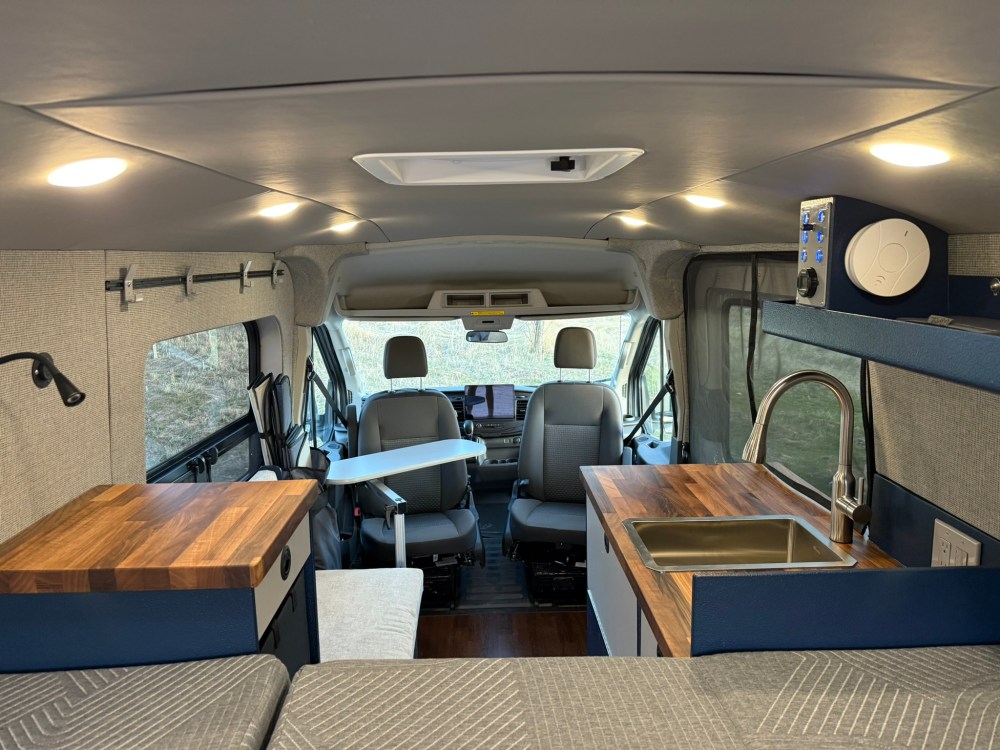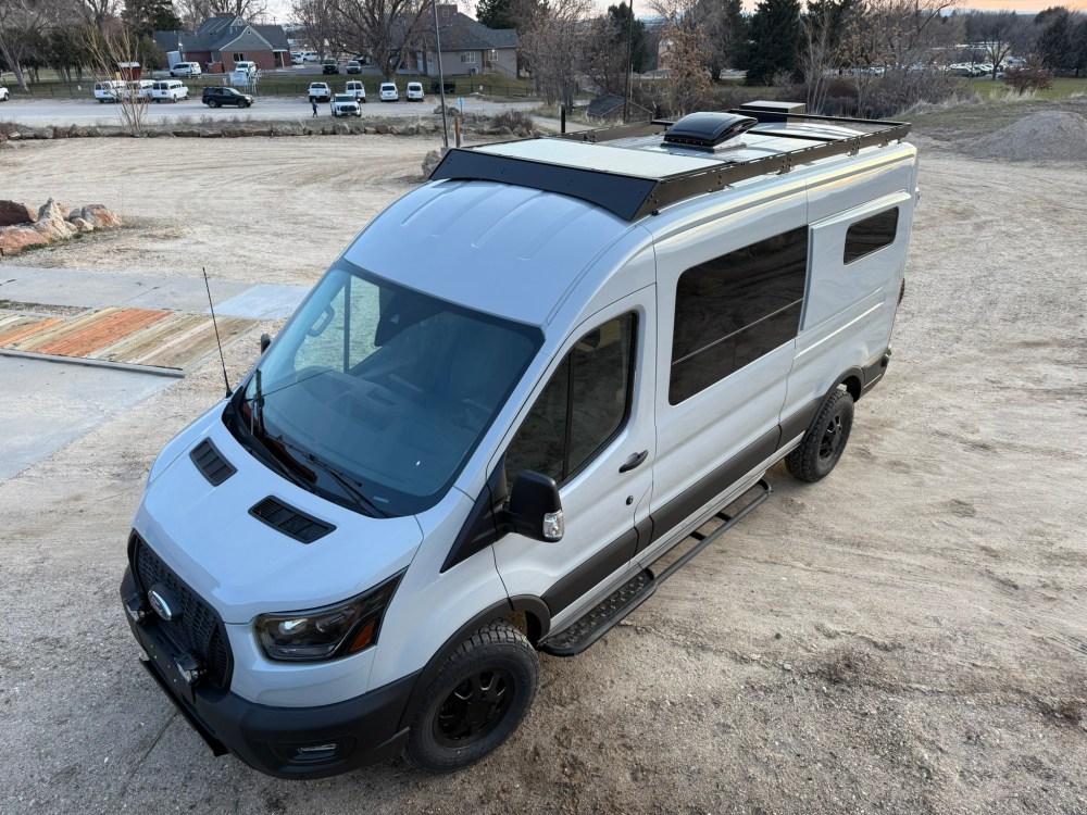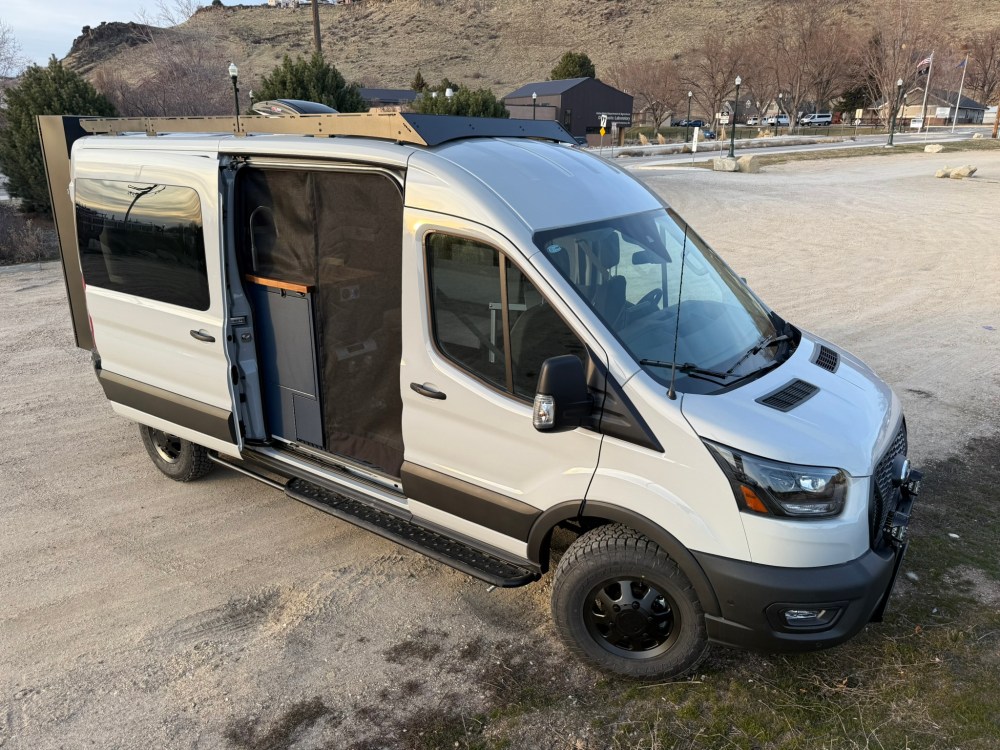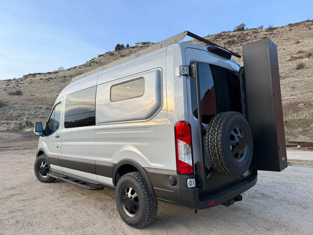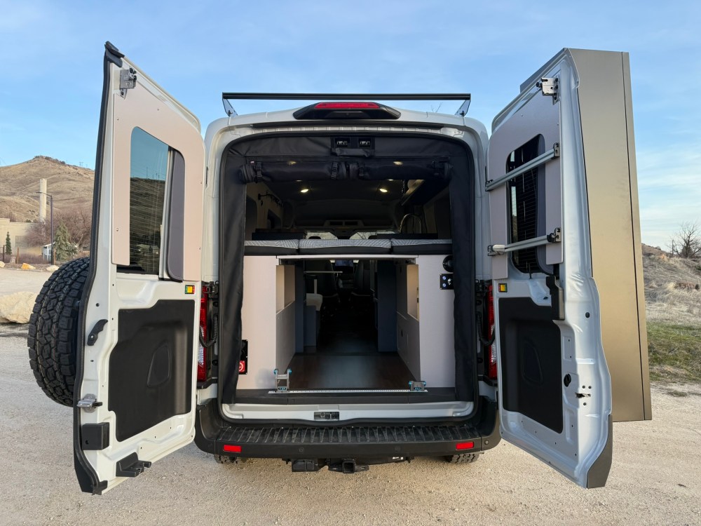 Exterior goodies include a AVC roof rack with 200watt solar panel, Van Compass Stage 1 lift , ski/board locker, and VanCentric OE wheels with Toyo Open Country mountain snowflake rated tires.