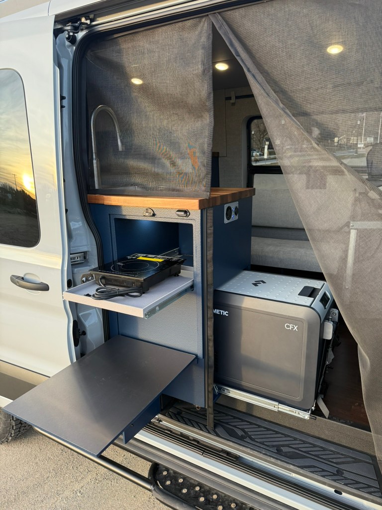 Our classic Kestrel layout which includes an indoor/outdoor kitchen in the slider door with hot and cold water, removable storage bins, 45L refrigerator and a walnut butcher block countertop. Full size loft bed in the rear with Flarespace flares to allow “east-west” sleeping and a full 52″ x 80″ bed space. There is an awning window and adjustable reading lights at the head of the bed. Ample gear storage underneath and in the side pod cubbies. The rear threshold plate with integrated L-track allows for bike and gear storage options.