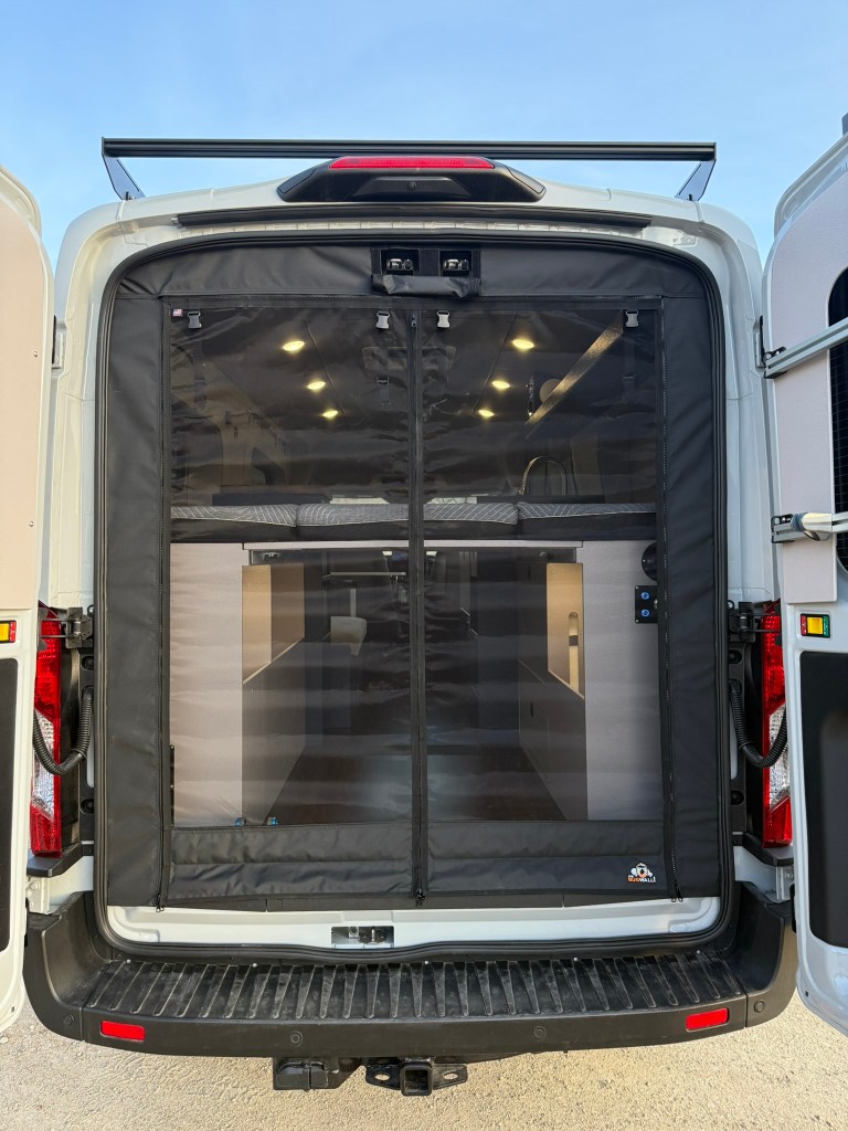 This van includes a roof fan, and opening windows for ventilation, a gasoline powered air heater, and a full set of insulated window shades, and door screens.