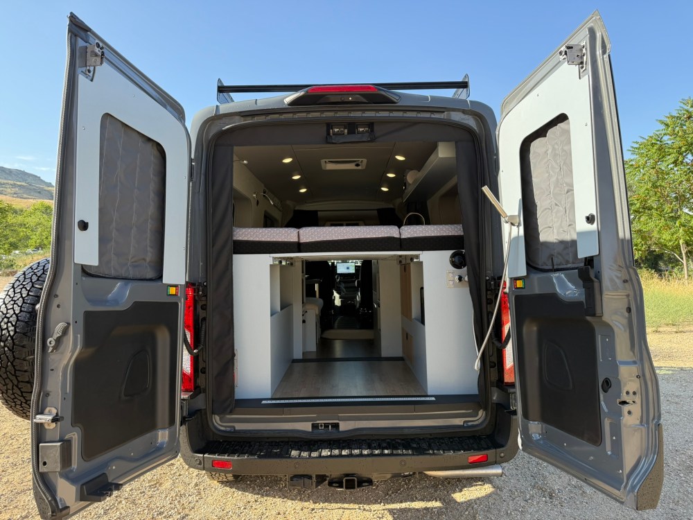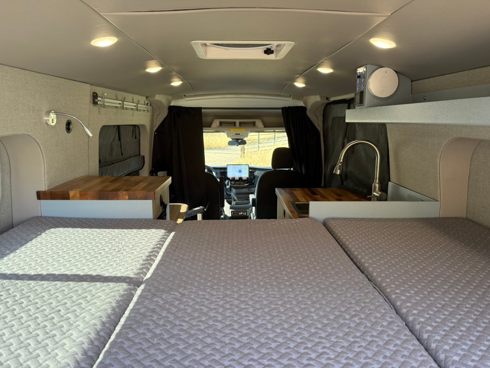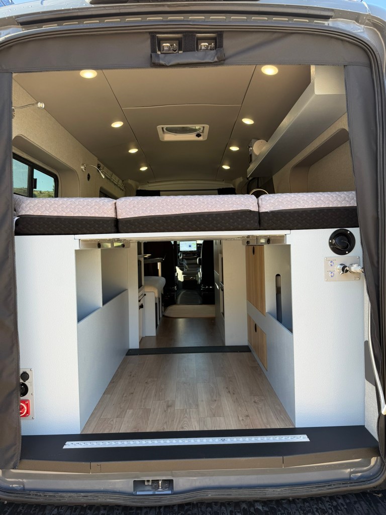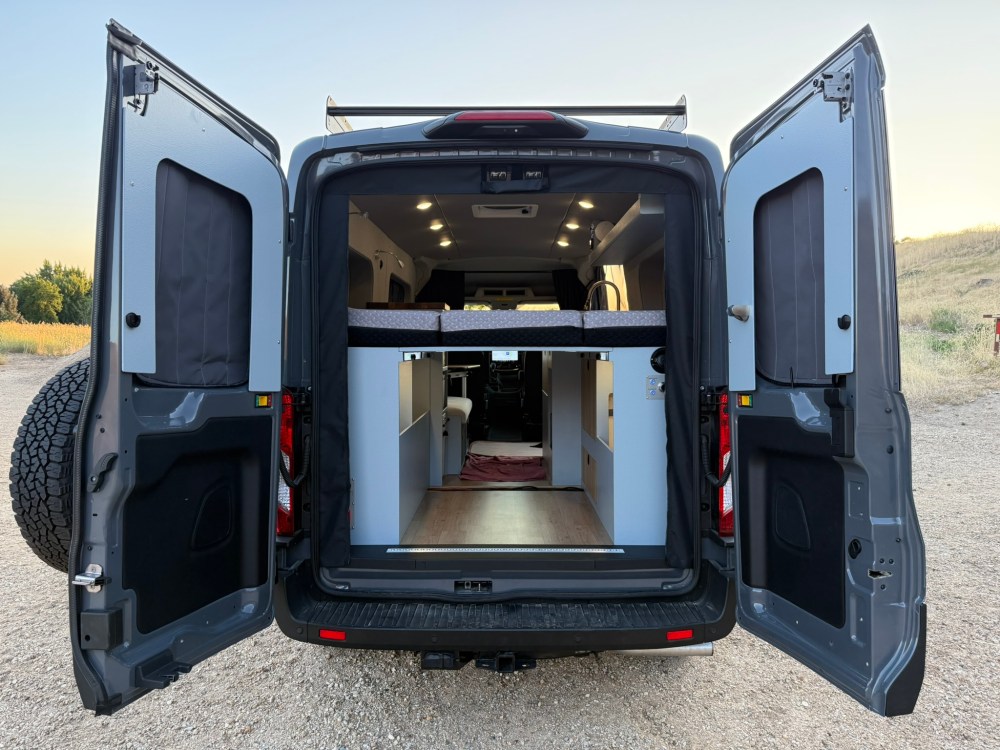 Full size loft bed in the rear with Flarespace flares to allow “east-west” sleeping and a 79” length bed space. There is an awning window and adjustable reading lights at the head of the bed. Ample gear storage underneath and in the side pod cubbies. The rear threshold plate with integrated L-track allows for bicycle fork mounts.