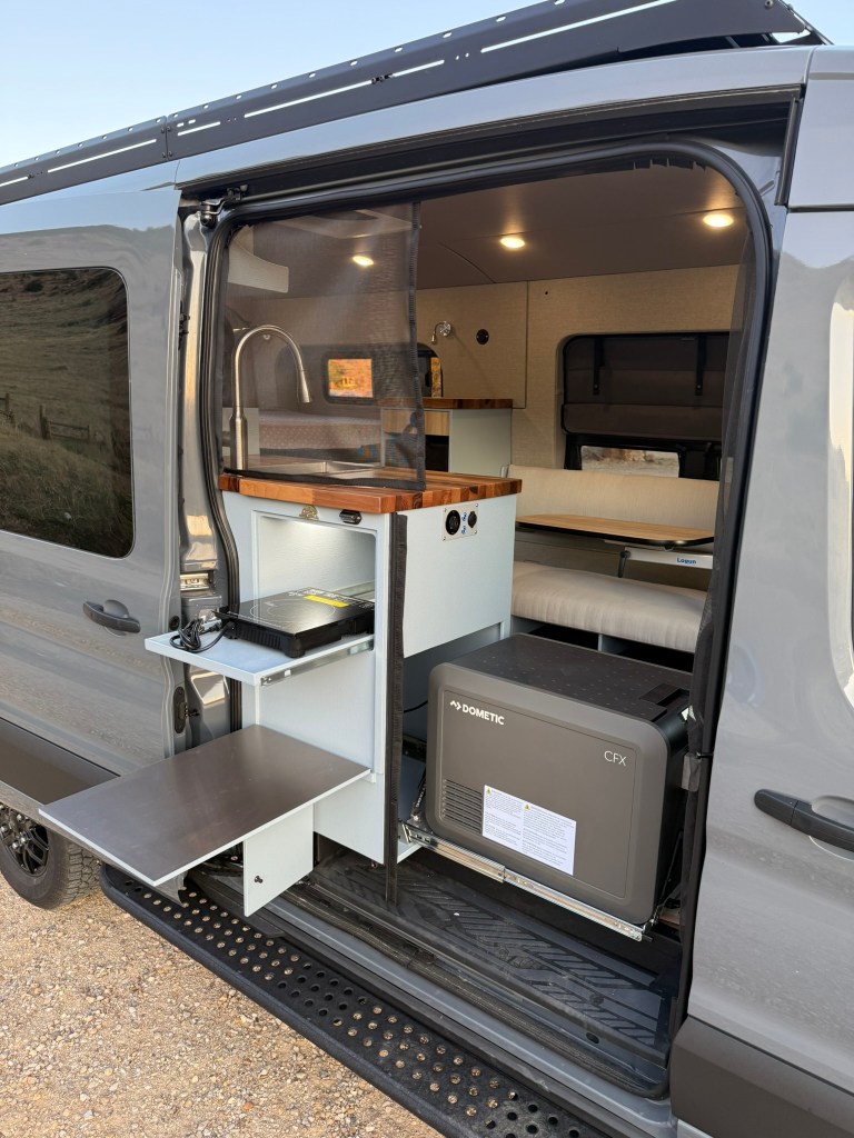 Our classic Kestrel layout which includes an indoor/outdoor kitchen in the slider door with stainless steel exterior drop down table, pass through shelf with induction cooktop, a drawer, removable storage bins and a slide out 45L refrigerator.