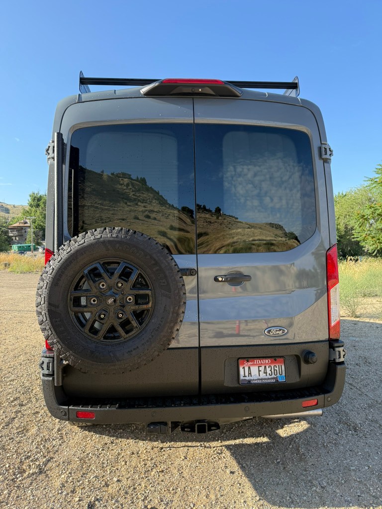 Flatline Van Co. spare tire rack with 5th Trail wheel and TPMS sensor