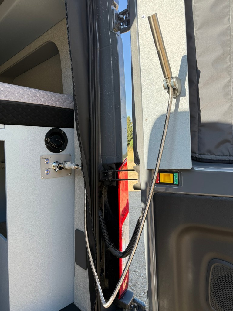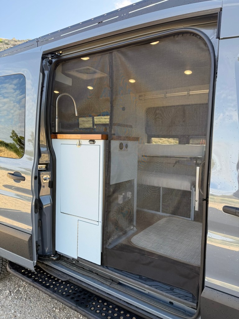 This van includes a roof fan, and opening windows for ventilation, a gasoline powered air and hot water heater, a full set of insulated window shades, and door screens. The Havelock wool insulation is very extensive and does a great job at keeping out the cold as well as keeping out the hot in the summer.