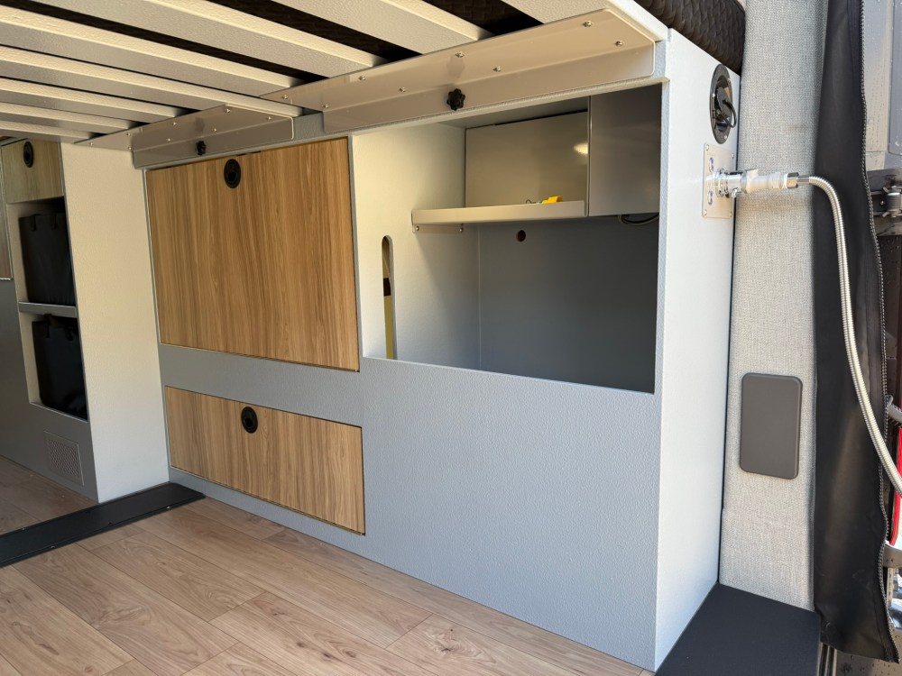 The bedside nightstand also has removable storage crates a drawer and a composting separating toilet which glides out from below. The crates are great for taking inside when loading or unloading, laundromat, grocery store, etc. whether its clothes, food, or gear, they are super convenient, take up less space and lighter than drawers. The drivers side bench seat has even more storage options below. You can set up the swiveling table at the bench seat or at the factory swivel seats via the Lagun swiveling table mount.